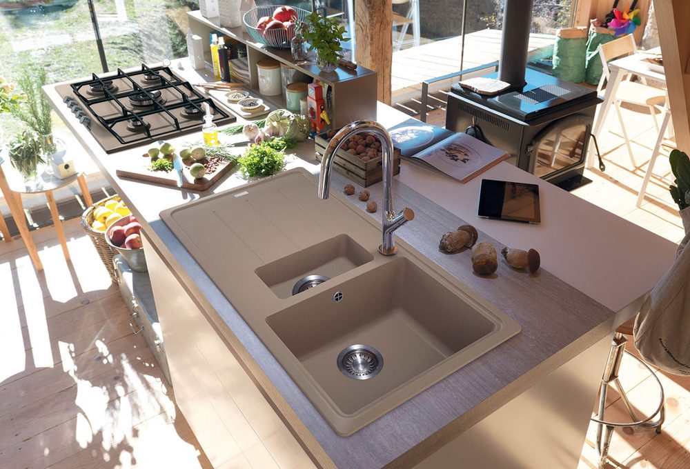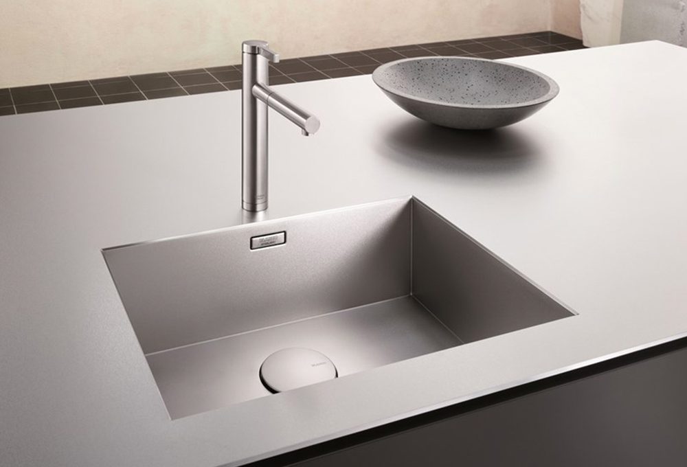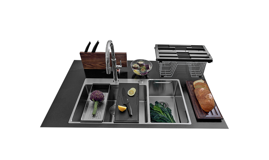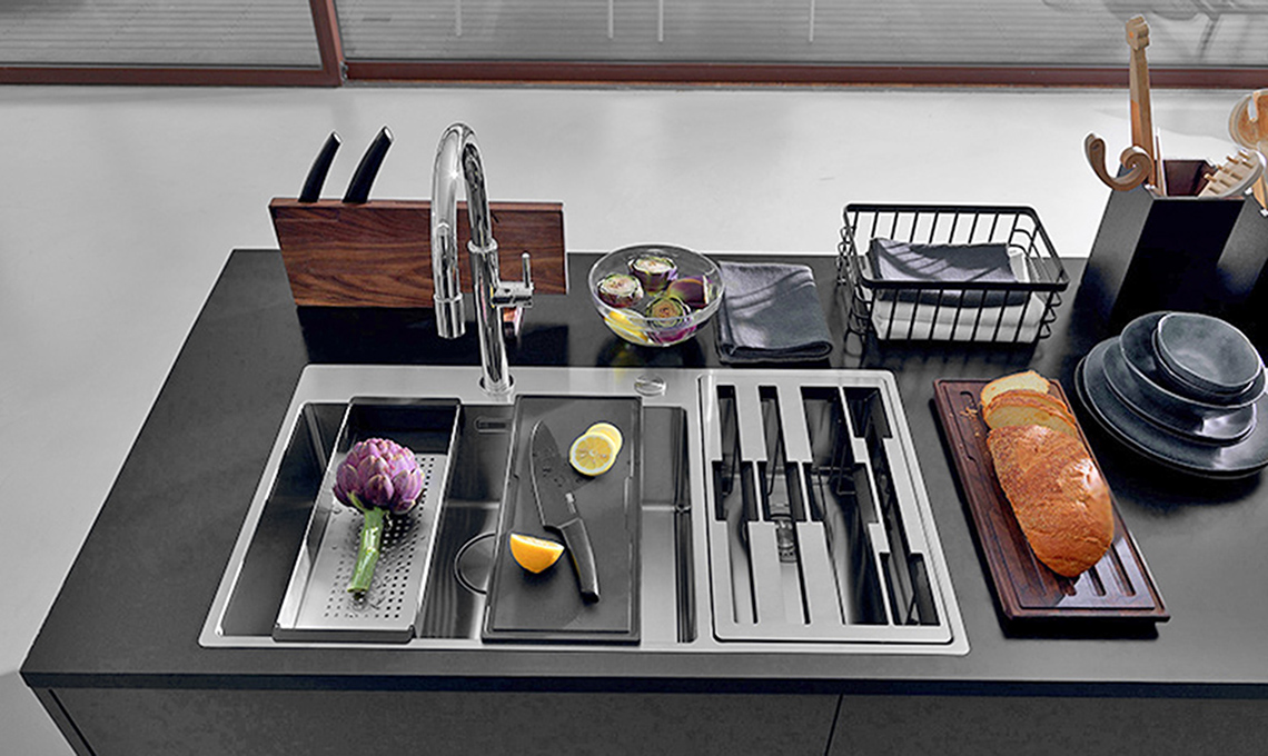 Box Center in acciaio inox ha la seconda vasca con cover a divisori che accoglie tutti gli strumenti, inclusi i taglieri [Franke].