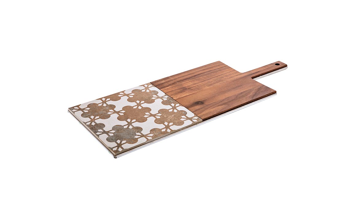 • Al posto delle classiche tovagliette americane, perché non usare taglieri di design? Con preziosi inserti in porcellana [KnIndustrie, cm 52x20 94