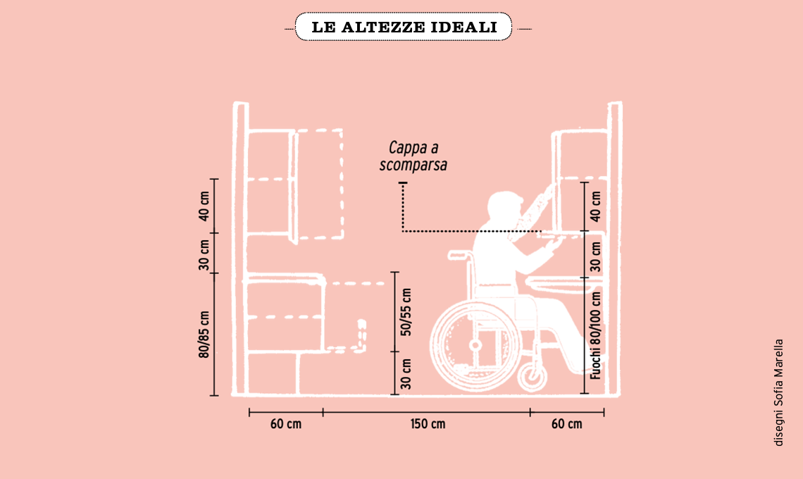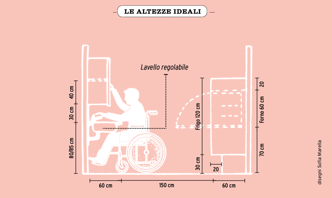 La carrozzina ha bisogno, per fare il giro su se stessa, di uno spazio libero di ø cm 150/170 e per usare fuochi e lavello la persona deve potersi infilare sotto senza che le gambe li tocchino (intradosso a cm 60/75 da terra). I pensili devono avere il ripiano più alto a cm 150 da terra, o essere attrezzati con saliscendi. Le basi devono avere lo zoccolo alto cm 30 e rientrante di 20, per far stare sotto i piedi.