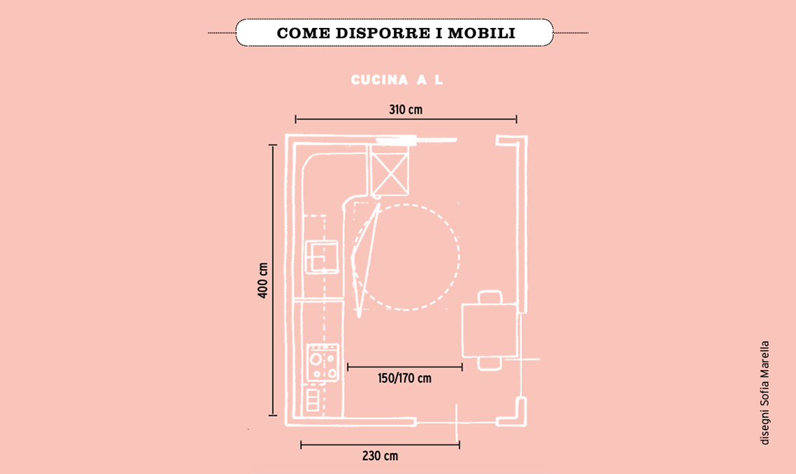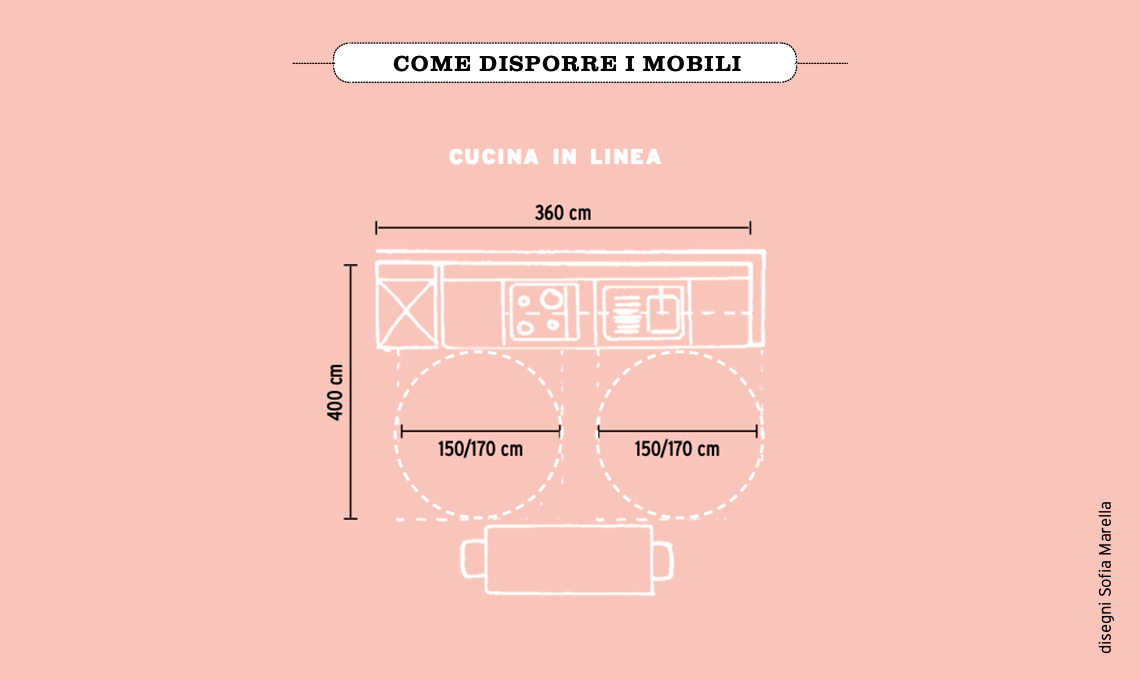Per lavorare con agio, la zona fuochi-lavello – da mettere al centro – è sospesa, così ci si può infilare sotto. Il tavolo da pranzo deve distare almeno cm 150 dai mobili.