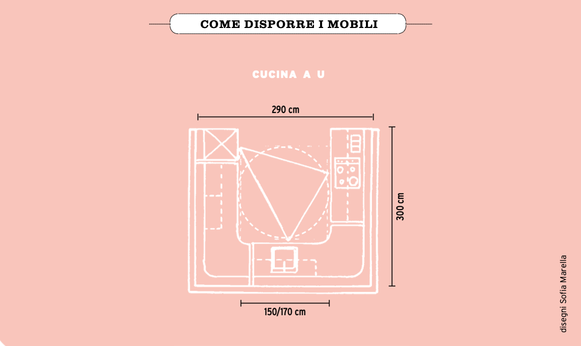 È la soluzione migliore, poiché tutto è facilmente raggiungibile ruotando su se stessi: piano cottura, lavello e frigorifero- dispensa vanno sui tre lati della cucina.
