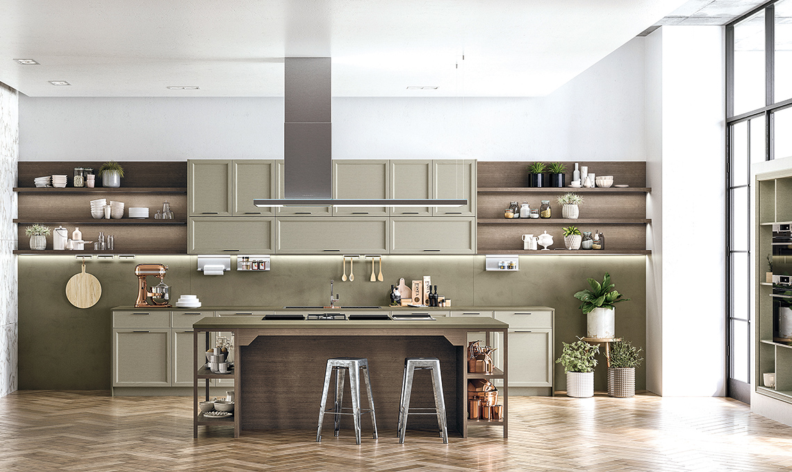 è ideale negli ambienti di ispirazione rétro, per ‘stemperarli’ con tocchi moderni. Le case d’epoca restaurate hanno un appeal unico ma a volte inserirvi una cucina in stile rétro può creare un’atmosfera ridondante. La soluzione, dunque, è trovare un modello che mixi classico e moderno. Vogue di Doimo Cucine è proprio così: accosta l’anta a telaio di una volta – rivisitata però in chiave minimal – a elementi contemporanei hi-tech come il top e lo schienale.