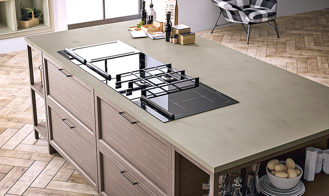 Anche l’isola centrale con i fuochi ha il piano di lavoro rivestito in ecomalta finitura Tufo e i terminali laterali a giorno. Inoltre, il top si allunga in profondità, dando vita al bancone per la colazione. La cappa minimal a isola, in acciaio con mensola asimmetrica, è l’elemento hi-tech.