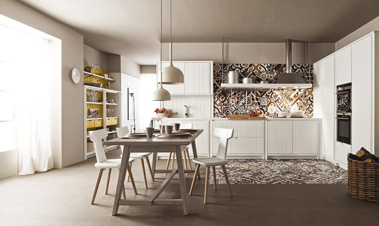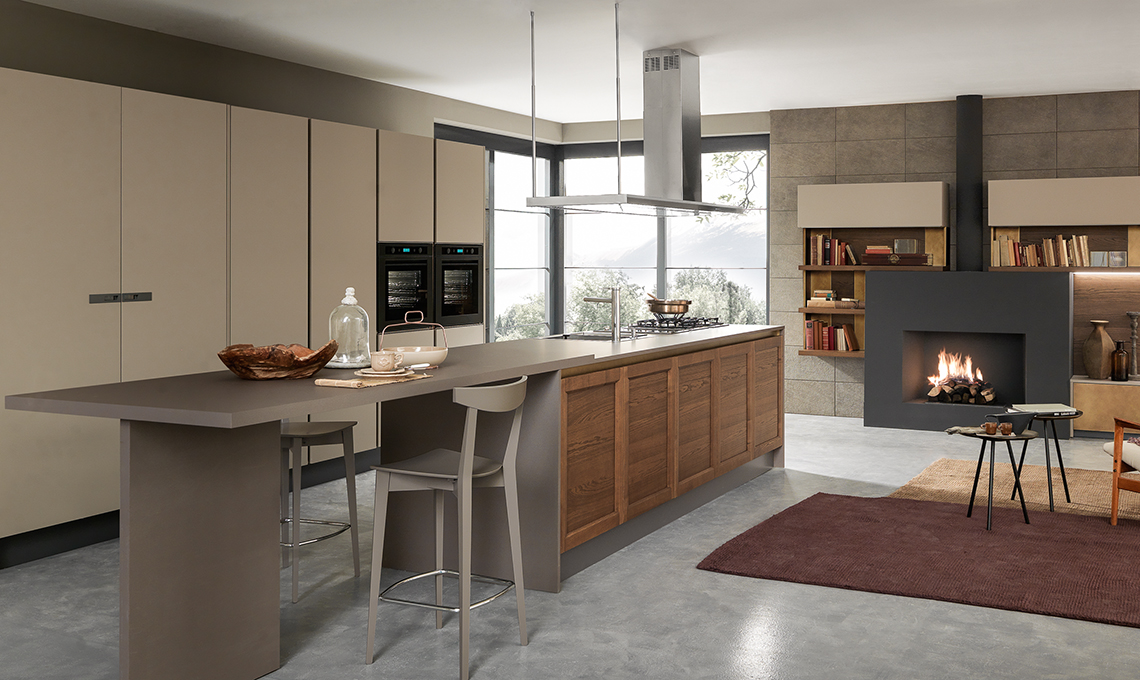 Materiali e nuances dei mobili di cucina con isola al centro e parete attrezzata sono uguali e creano un ambiente caldo, elegante e accogliente
