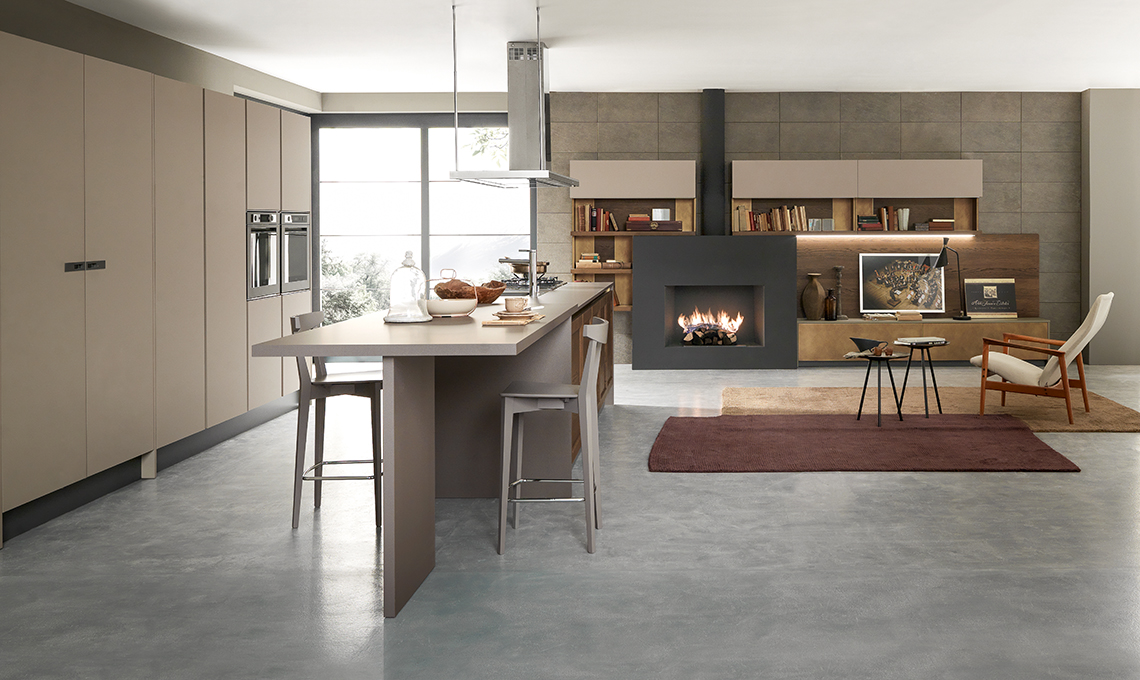 La maxi-isola american style risponde alle esigenze di chi ama cucinare e mangiare in compagnia. In questa versione, infatti,Class Line di Febal Casa integra perfettamente, grazie alla versatilità dei vari elementi, la zona cucina – organizzata con un’intera parete contenitiva a colonne e l’isola di lavoro con grande bancone snack – all’area relax in cui gioca da protagonista la parete attrezzata che ospita anche il camino. Il tutto racchiuso in un’elegante continuità di stile, colori e materiali. Il bancone-snack per 6/8 persone diventa un informale ma raffinato tavolo da pranzo.