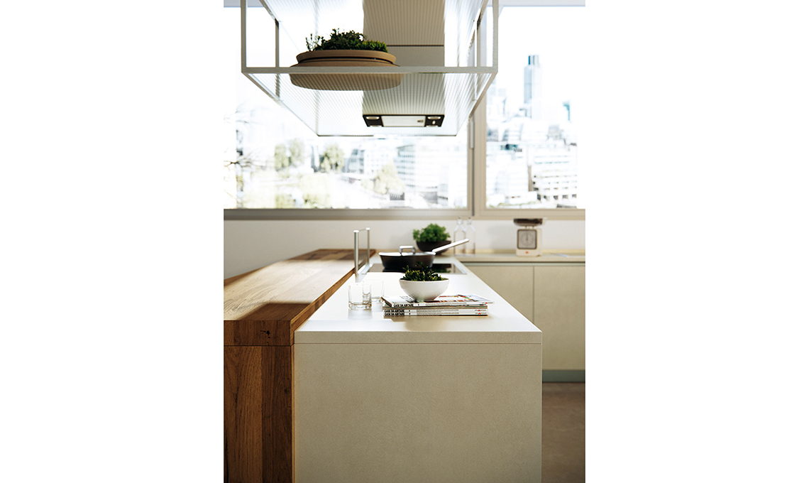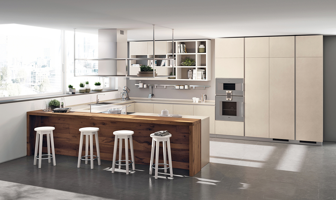 Mood minimal garantito dalle ante della cucina LiberaMente di Scavolini, formate da sottili lastre in grès nel colore Open space Kerlite, prive di maniglia perché dotate di profilo a gola. Per la colazione o un pranzo informale c’è il bancone snack realizzato in Rovere Vintage: questa calda essenza è ideale con la tonalità chiara ed elegante di ante e top. Completano gli sgabelli Weimar [Scavolini].