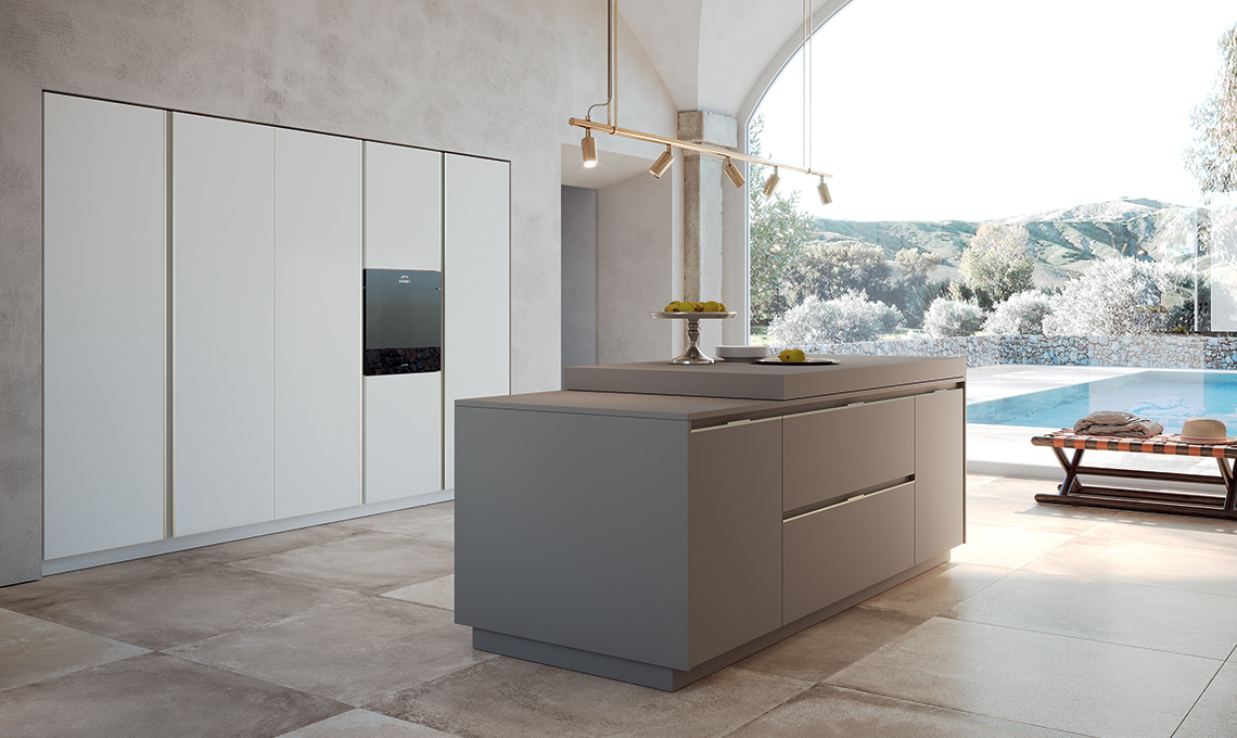 Era di Febal, dominata dall’isola scultorea realizzata in laminato Fenix® Castoro e dotata di un top scorrevole che ne rende l’uso dinamico. Le gole verticali e