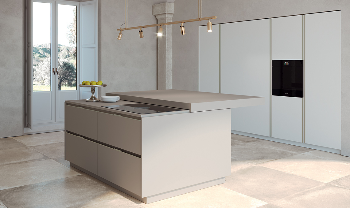 l top dell’isola è scorrevole: di norma nasconde il piano cottura, ma basta spostarlo in avanti o lateralmente perché dia vita a un comodo piano per la colazione,