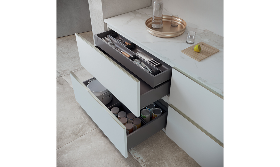 La maniglia in alluminio champagne è la stilosa protagonista dei cassettoni delle basi che, una volta aperti, svelano una pratica organizzazione interna mirata a garantire un utilizzo razionale dello spazio e un ordine perfetto.