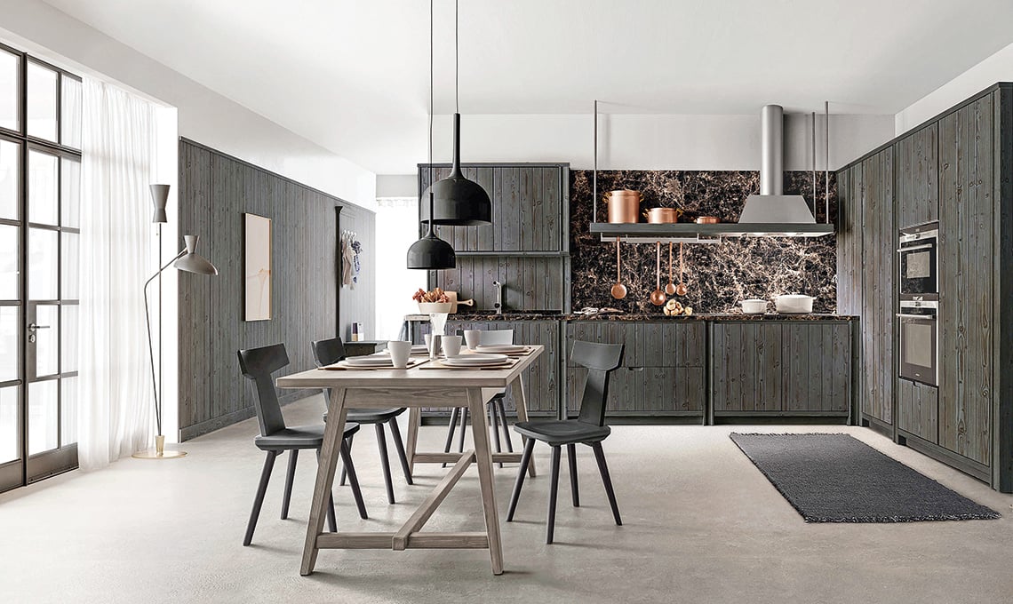 La cucina Maestrale è realizzata in massello di abete, con i frontali di ante e cassetti dogati: la nuova tinta Carbone rende decisamente moderno un materiale dalla lavorazione e dall’aspetto 'classici'. Se non sei convinta del total black, puoi spezzarlo con un tavolo in massello sbiancato.