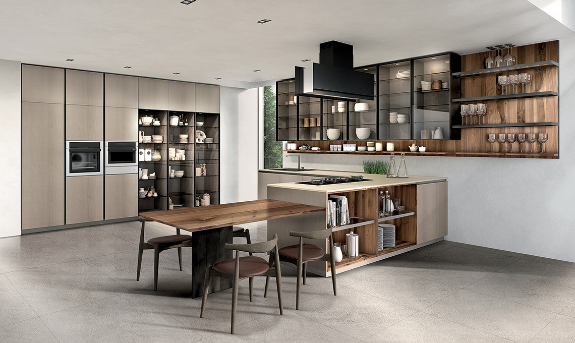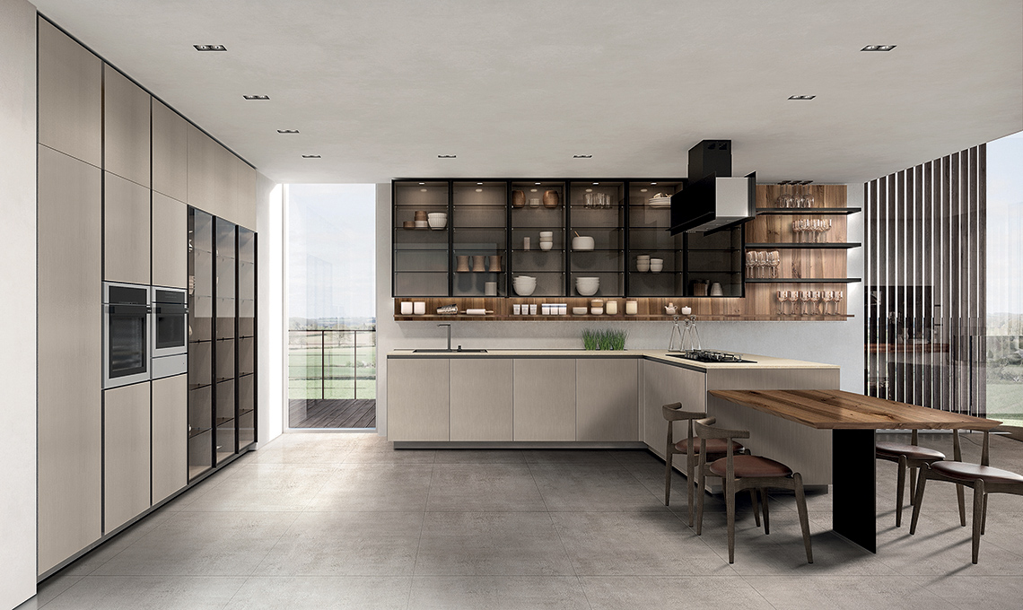 Telero di Euromobil, con le ante di basi e colonne laccate effetto acciaio satinato dal mood metropolitano, come le ante in vetro fumé. Il tutto è scaldato dalla boiserie e dal tavolo in Noce Materia e dal piano di lavoro in quarzo finitura Sand.