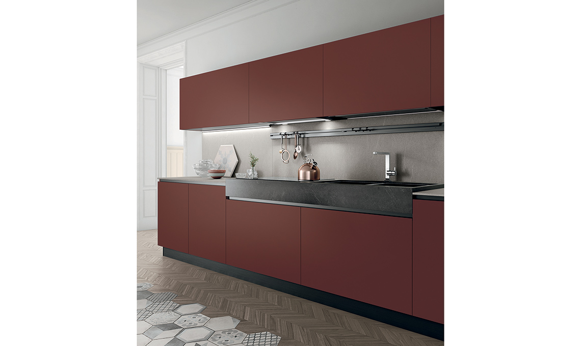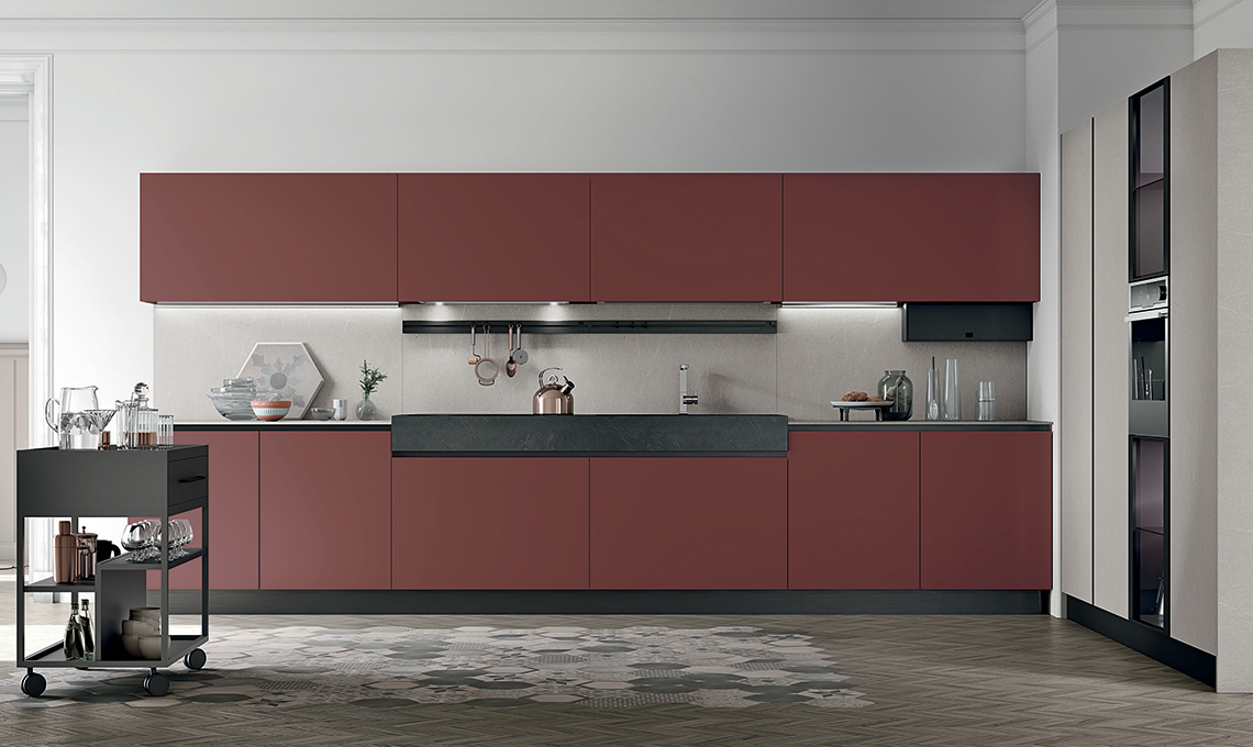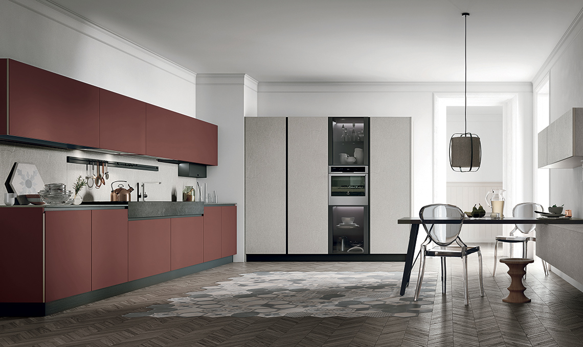 Alevè di Stosa Cucine, qui con colonne in laminato materico finitura Pietra Piasentin che si sposa perfettamente con il laccato UV Rosso Vino opaco di basi e pensili. Un abbinamento che non passa inosservato e rende la cucina protagonista anche quando è open sul soggiorno.