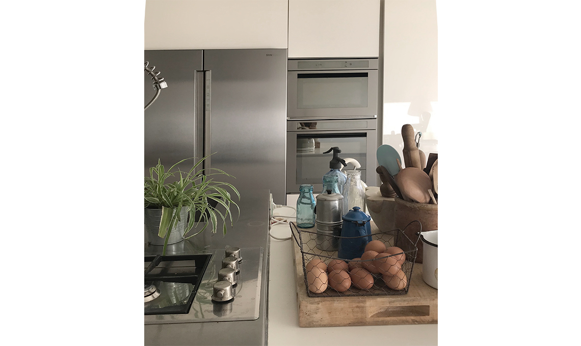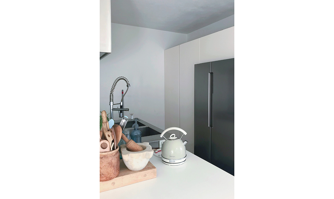 Sul piano di lavoro in corian ho aggiunto elementi pratici che scaldino l'ambiente. Tra questi un pezzo di marmo grigio venato, ottimo per poggiare le crostate o il pane. Di recente ho deciso di posizionare anche l’asse di legno della mia nonna Amelia, che utilizzava per fare la pasta all’uovo. Non mancano i contenitori presi ai mercatini che uso come porta-mestoli e i cestini in ferro cotto per riporre le uova.