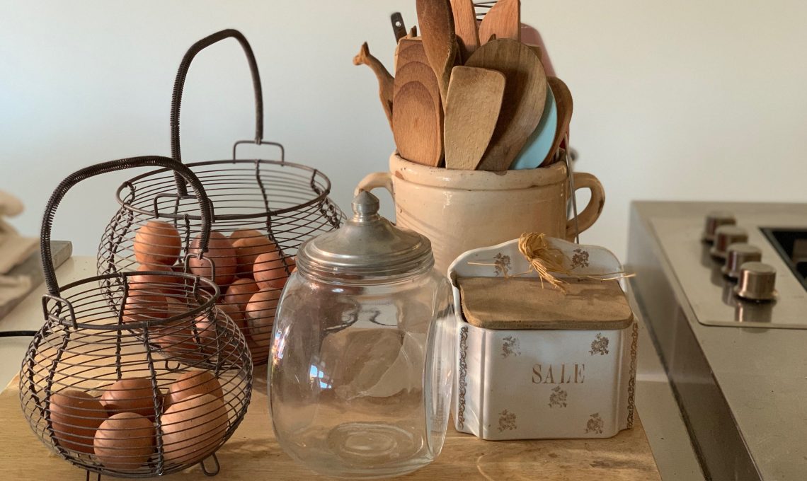 Ho costruito uno scaffale in legno di abete, per ora in stile raw, ma che un giorno diventerà bianco. Ho riposto all’interno i macinini acquistati ai mercatini, pentole in alluminio e di terracotta per fare il pane, taglieri di legno, matterelli, mortai, vassoi e formelle per biscotti riposte in scatole di latta.
