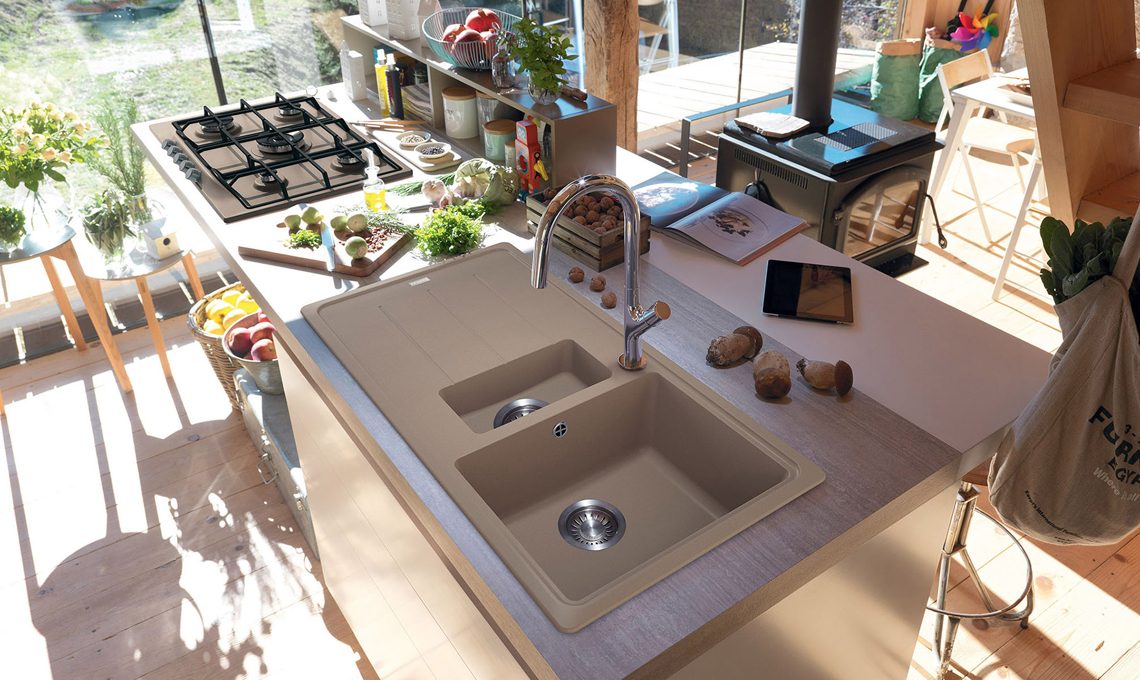 Il color cammello, versatile e disinvolto ma très chic al tempo stesso, è un neutro che fa stile, anche in cucina, dove il colore si chiama Oyster e la collezione Maris Urban. Il lavello in Fragranite si coordina con il miscelatore con doccetta estraibile, il forno multifunzione in vetro e il piano cottura cinque fuochi.