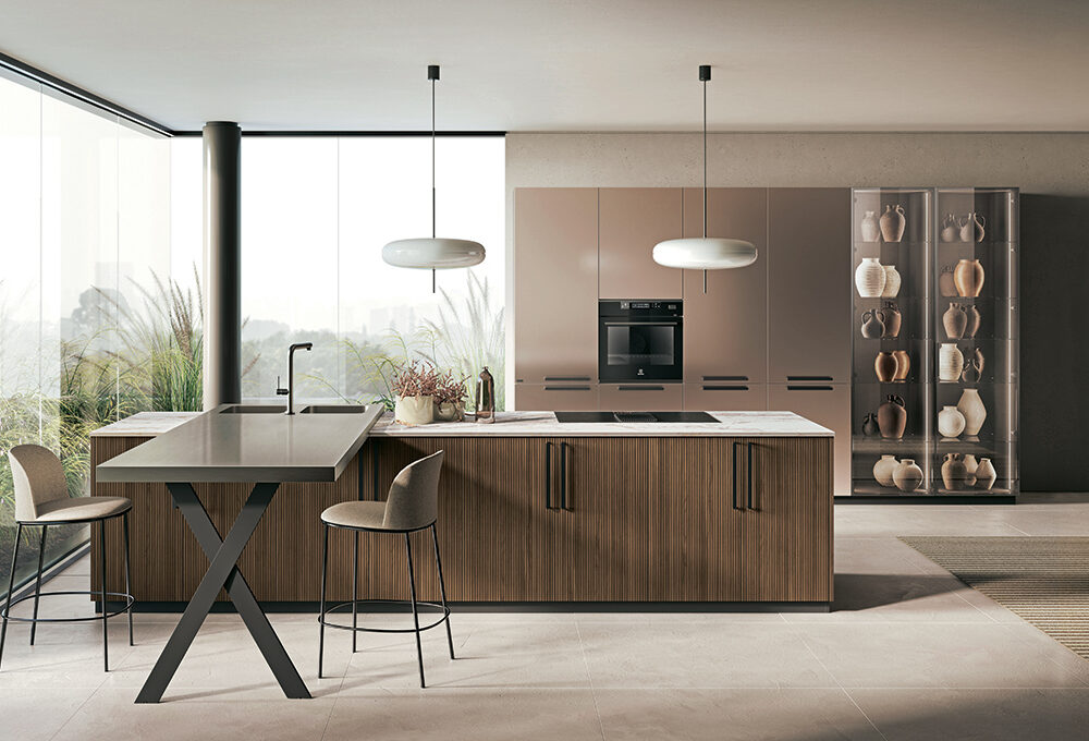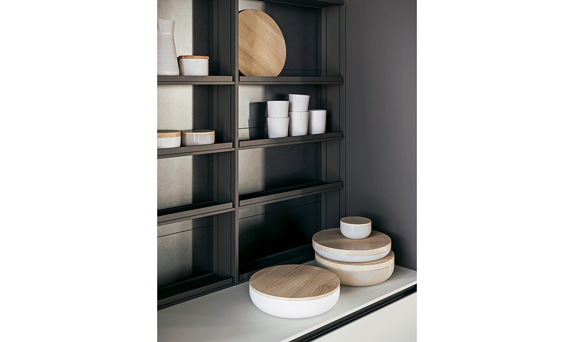 La boiserie a parete è rivestita in Aldust, una lamina in alluminio (spessa circa 1-1,5 mm) verniciata con polveri epossidiche e stesa a mano. Le colonne hanno la gola a tutta altezza che ne sottolinea la verticalità. Per tenere a disposizione ciò che serve per cucinare senza fare fatica, c’è il sistema di moduli a giorno Flag Moka Stone con barriera anticaduta.
