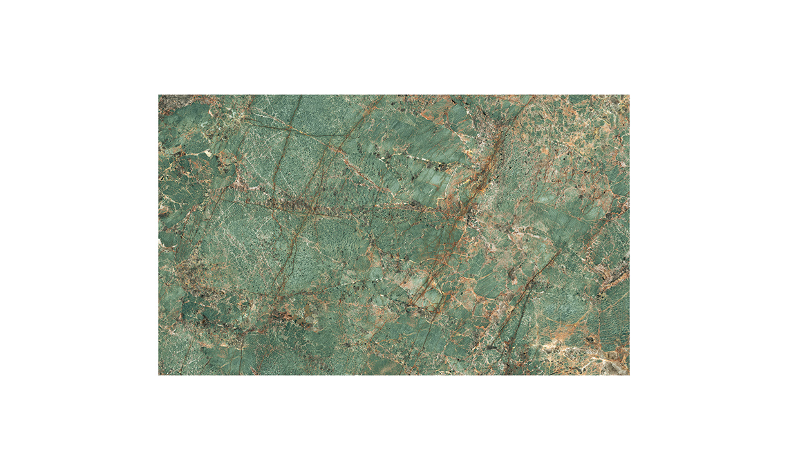 1. Classico. Premiere Amazzonite (in lastre da cm 60x60 a 120x260) effetto marmo con un fondo verde e venature di colore bianco, viola e marrone [Del Conca].
