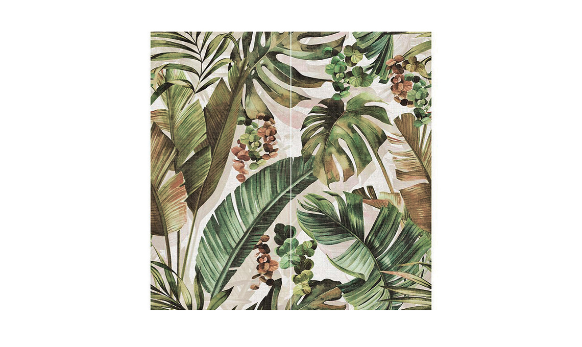 4. Botanico. Murales Polinesia (in formato da cm 60x120) porta un tocco jungle, fresco ed esotico in stile wallpaper [Iperceramica].