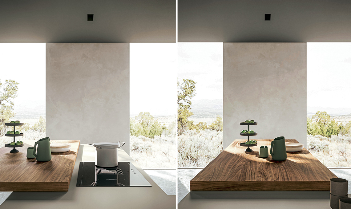 Cucina a vista? Grazie al top scorrevole puoi nascondere i fuochi e fare subito ordine. Il piano in legno che copre l’isola può scorrere orizzontalmente, per diventare banco snack e mettere in luce il piano cottura a induzione.