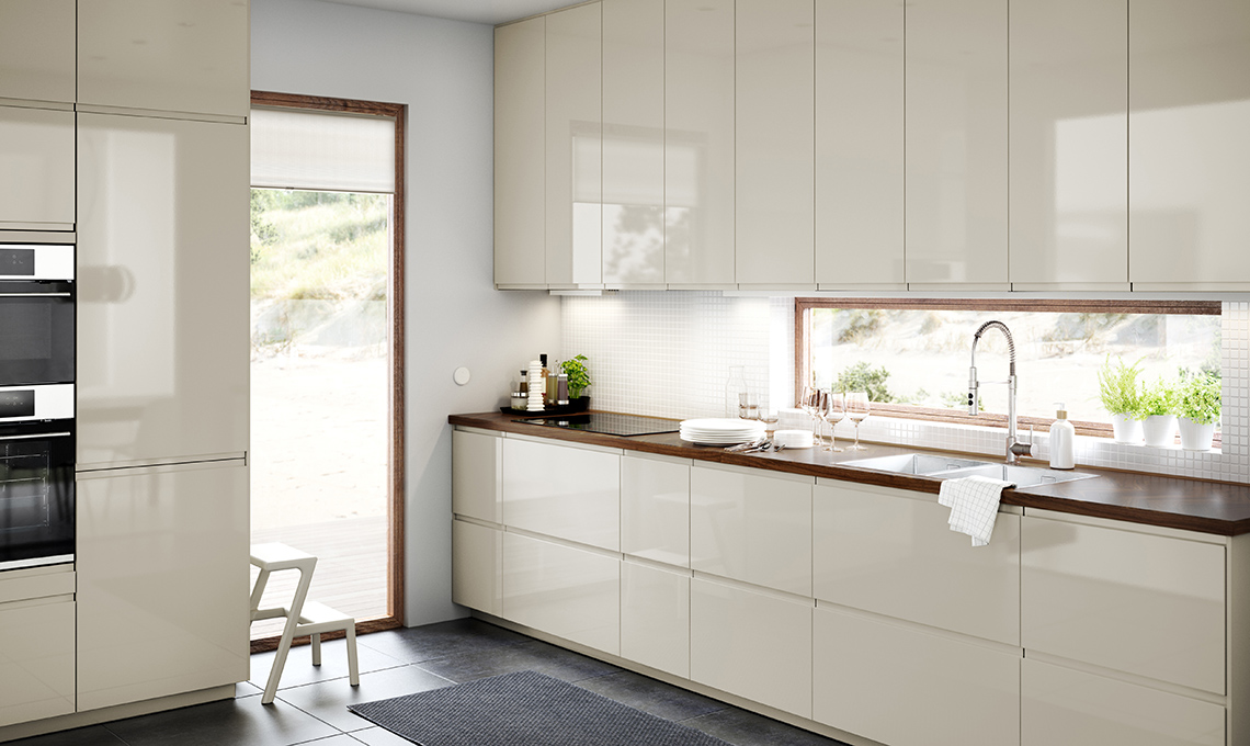 L’anta Voxtorp ha la maniglia integrata con i bordi arrotondati che garantisce una comoda presa per l’apertura e la chiusura [Ikea €70 l’anta da cm 40x120h; €6.770 la cucina in foto, lunga cm 420 completa di elettrodomestici].