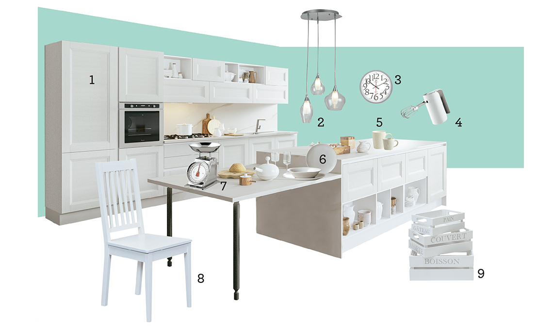 Il modello Caravaggio è la cucina bianca ed elegante che puoi personalizzare e progettare su misura (1). L'isola centrale o il tavolo saranno valorizzati dalla sospensione Skyline a tre luci (2). Le sedie Rio A1 donano un’eleganza semplice e raffinata alla cucina (8). Non possono mancare gli accessori giusti come lo sbattitore compatto HMM 6420 E di Beko (4) e la bilancia da cucina meccanica in acciaio inox ispirata ai modelli di una volta (7). La mise en place perfetta? Scegli le tazze Mandala con decorazioni a rilievo (5) e il servizio di piatti bianco Iris, classico ma sempre attuale (6). Per finire in cucina non possono mancare, un orologio come il modello Melody con movimento al quarzo e cassa in Abs (3) e i contenitori in legno Maison S1 che arredano e tengono in ordine i piccoli oggetti (9).