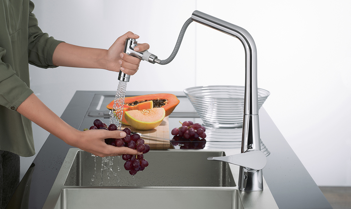 SI AZIONA CON IL DORSO DELLA MANO: Talis Select 300 di Hansgrohe, grazie a un tasto frontale per aprire l'acqua. In più ha ugelli di silicone con funzione anticalcare.