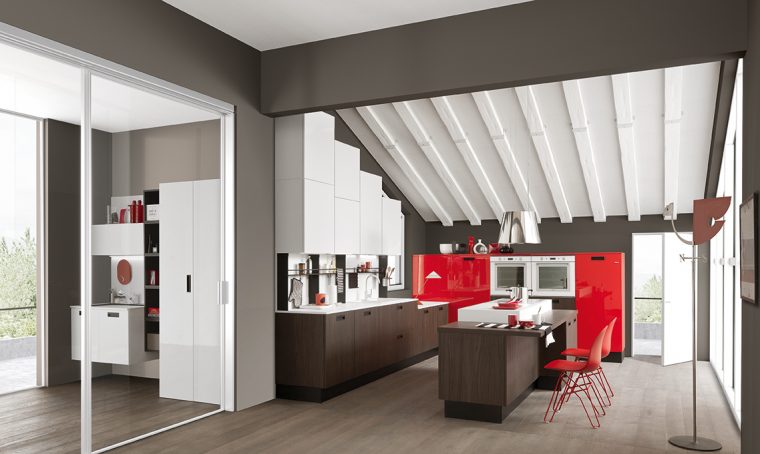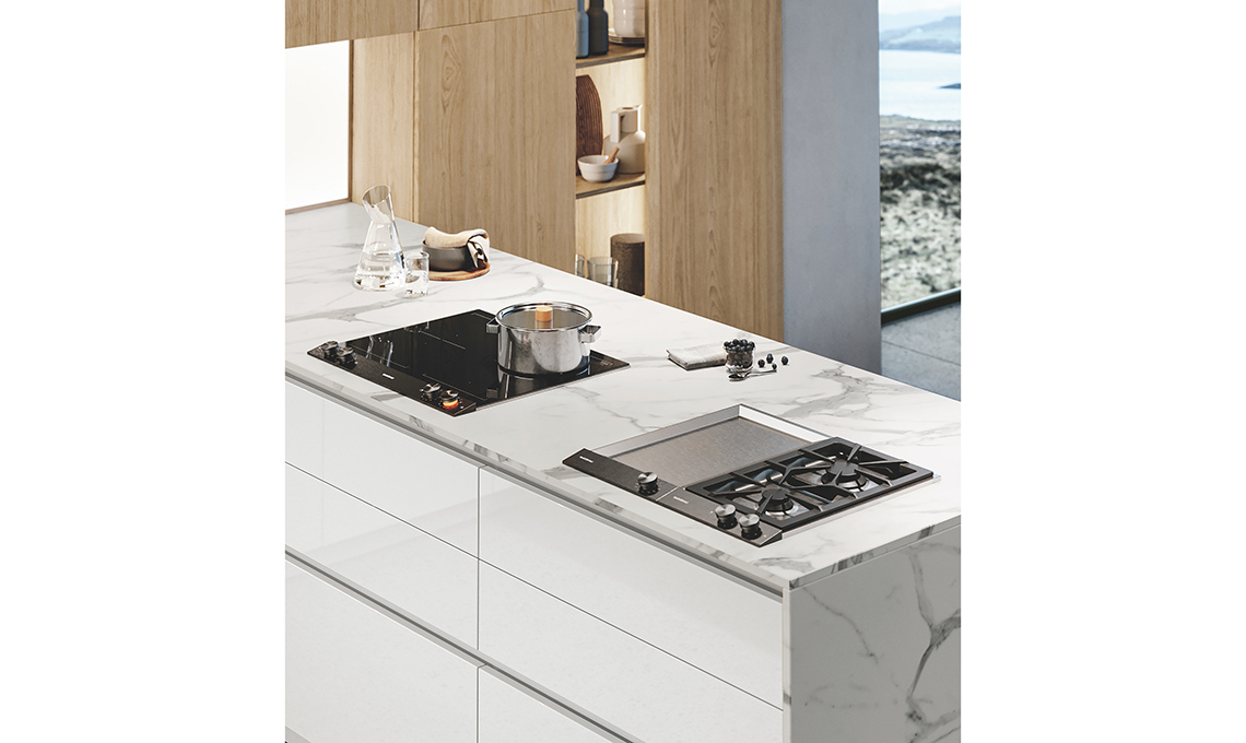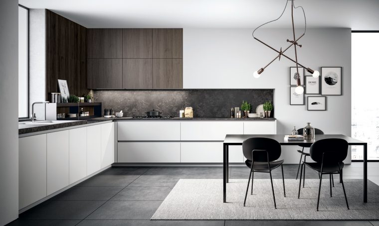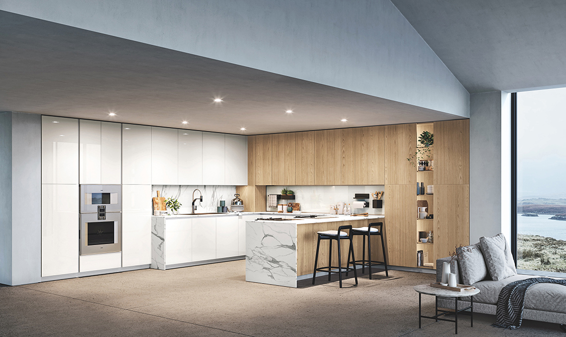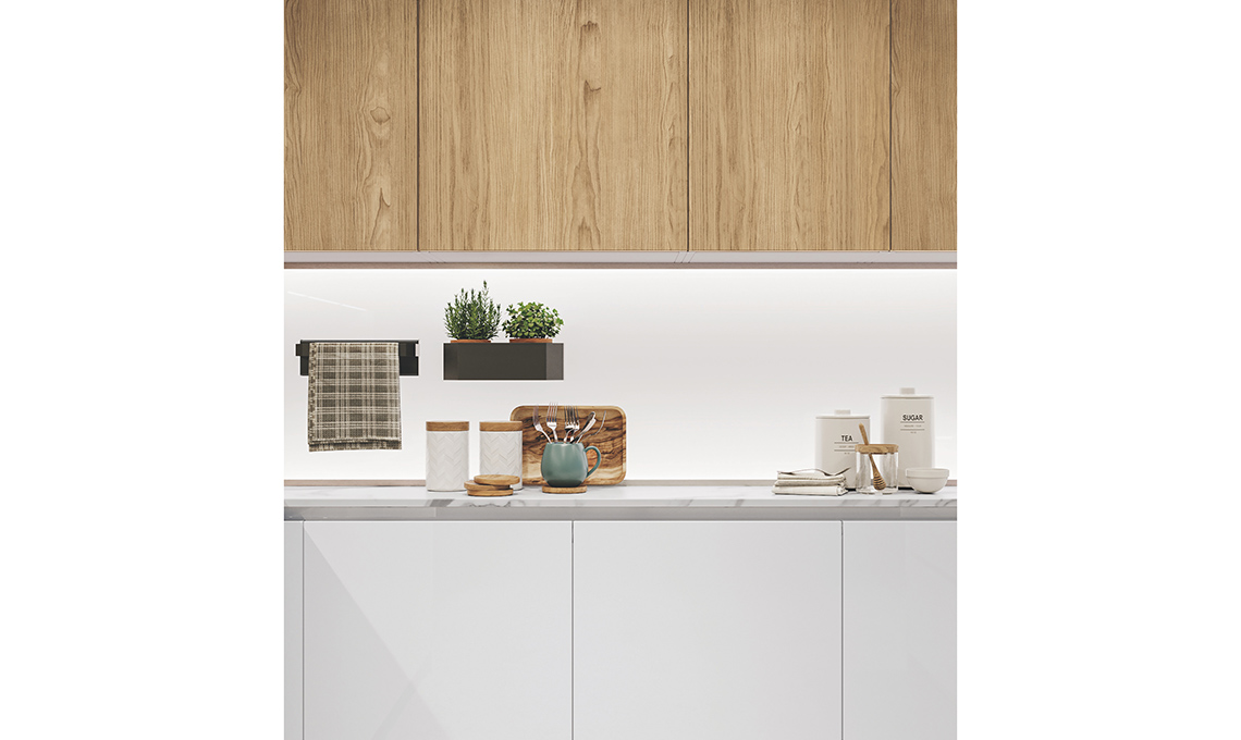 D23 di Doimo Cucine con basi, colonne e pensili in PET XGloss Bianco su un lato più colonne e pensili in Melamminico Synchroface Rovere Dogato Sesamo sull’altro; top e fianchi in laminato HPL Statuario Liscio e schienale luminoso magnetico.
