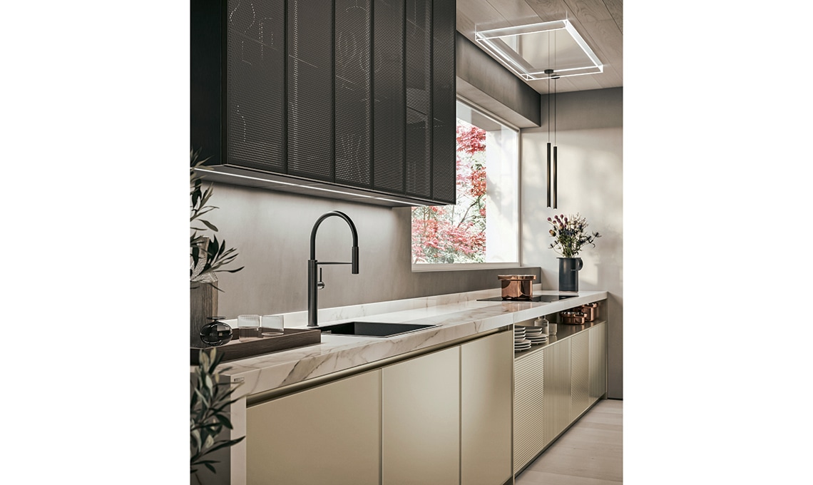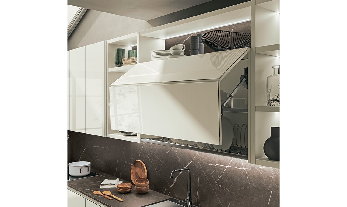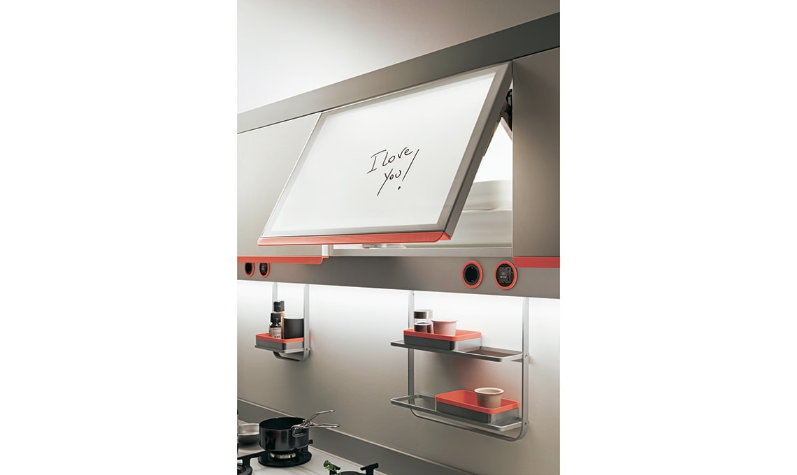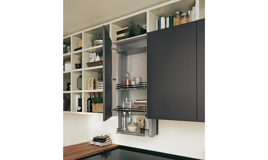 Per rendere la cucina fruibile a tutti (bambini e anziani compresi) ci sono sistemi smart come Selfmotion: è motorizzato e fa ‘scendere’ i ripiani interni di 46 cm, in totale sicurezza grazie anche alle barre di contenimento dei piani stessi.