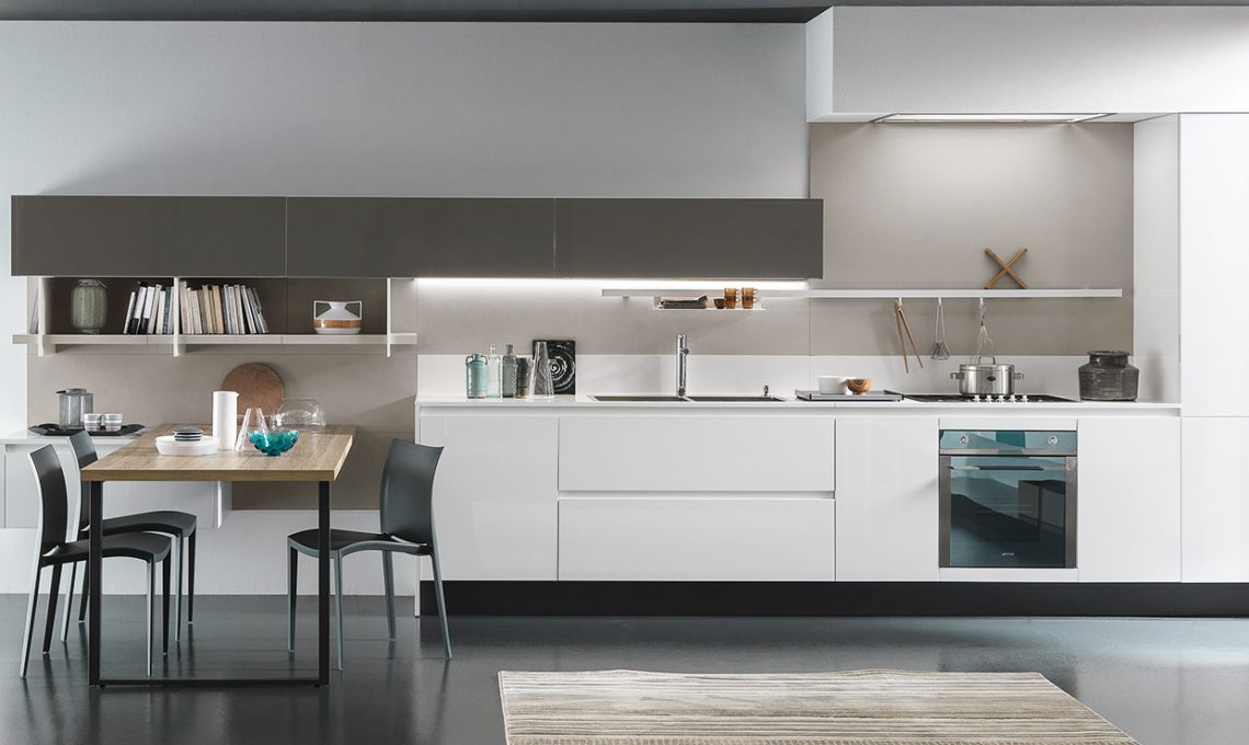 Cucina Charme 37, caratterizzata dal sottile top in Okite bianco assoluto: ante di basi e colonne in monolaccato lucido bianco neve e pensili in monolaccato lucido grigio asfalto, tavolo snack in Olmo Prado [Febalcasa].