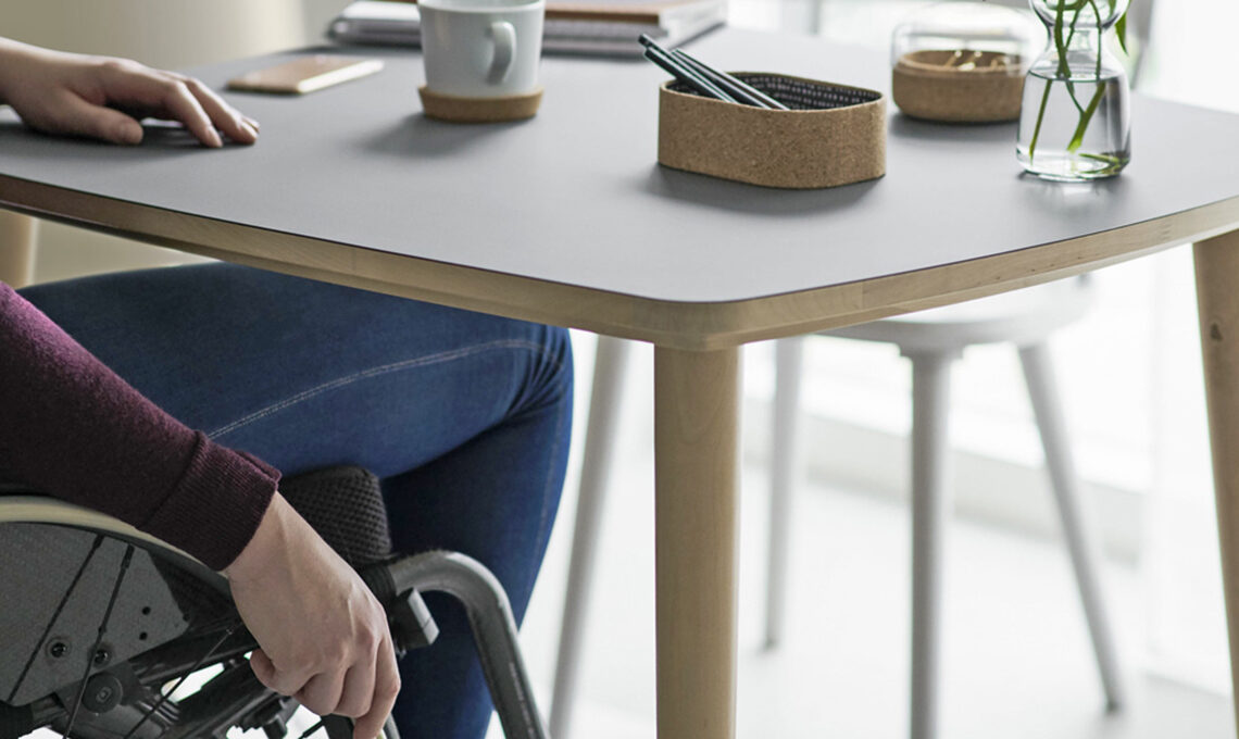 - Il tavolo ergonomico ha il top opaco anti-riflessi, i bordi morbidi al tatto e stondati e sotto il piano ‘sottile’ c’è tanto spazio per le gambe... di tutti.