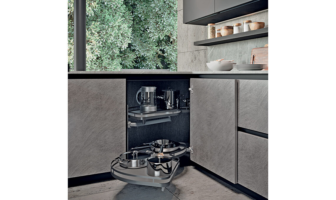 - Ripiani rotanti ed estraibili sfruttano al meglio gli angoli e consentono a chi li utilizza di accedere facilmente anche ai punti normalmente più scomodi.