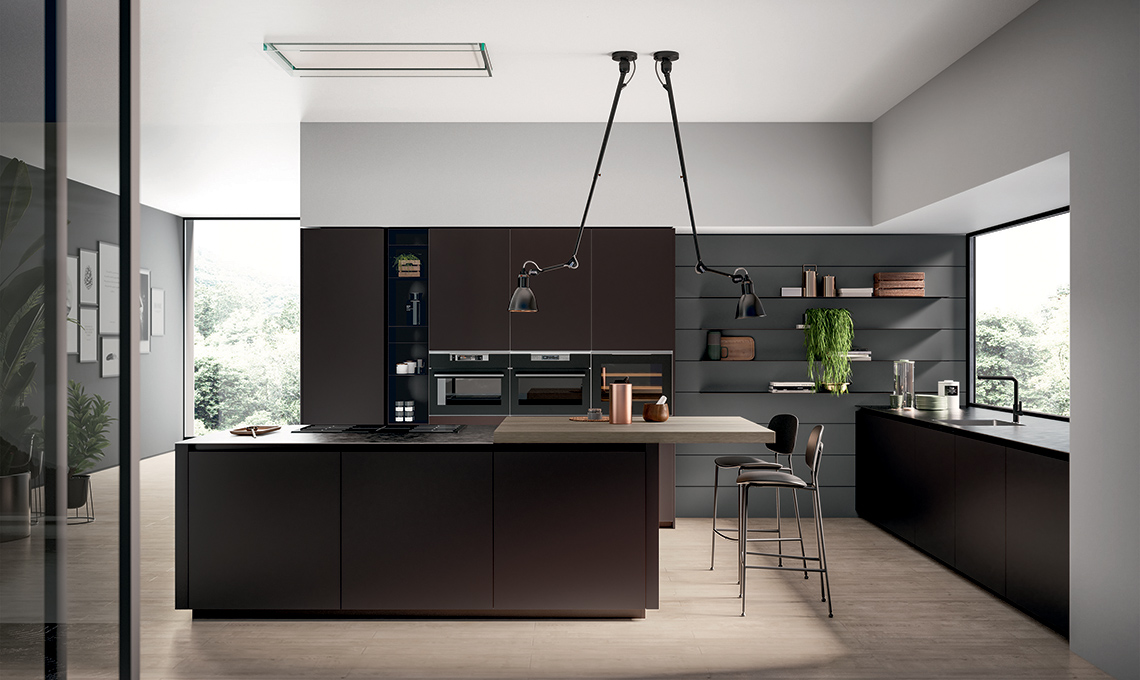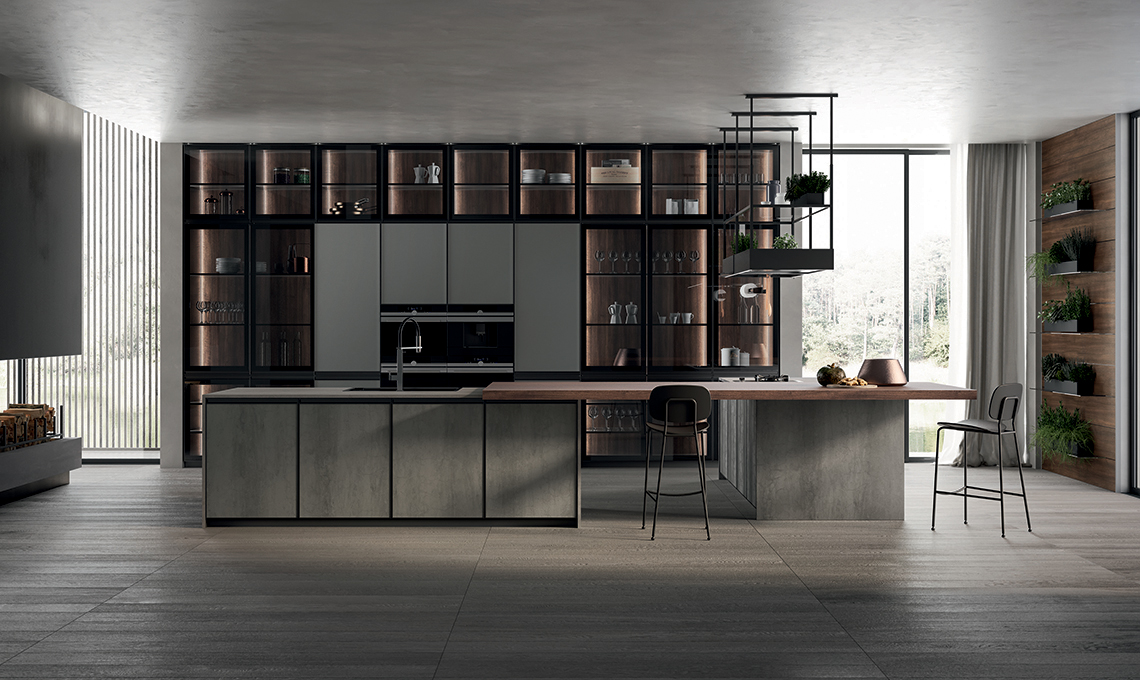 a giorno Air in finitura alluminio brunito [Arredo3]. I top dell’isola sono in acciaio finitura vintage, invecchiata e rigata, e in materico impiallacciato rovere safari per il piano snack. Lo spessore supersottile del top con vasca integrata (che crea continuità) è ripreso dalle mensole in metallo brunito della boiserie in PET maximatt lavagna.