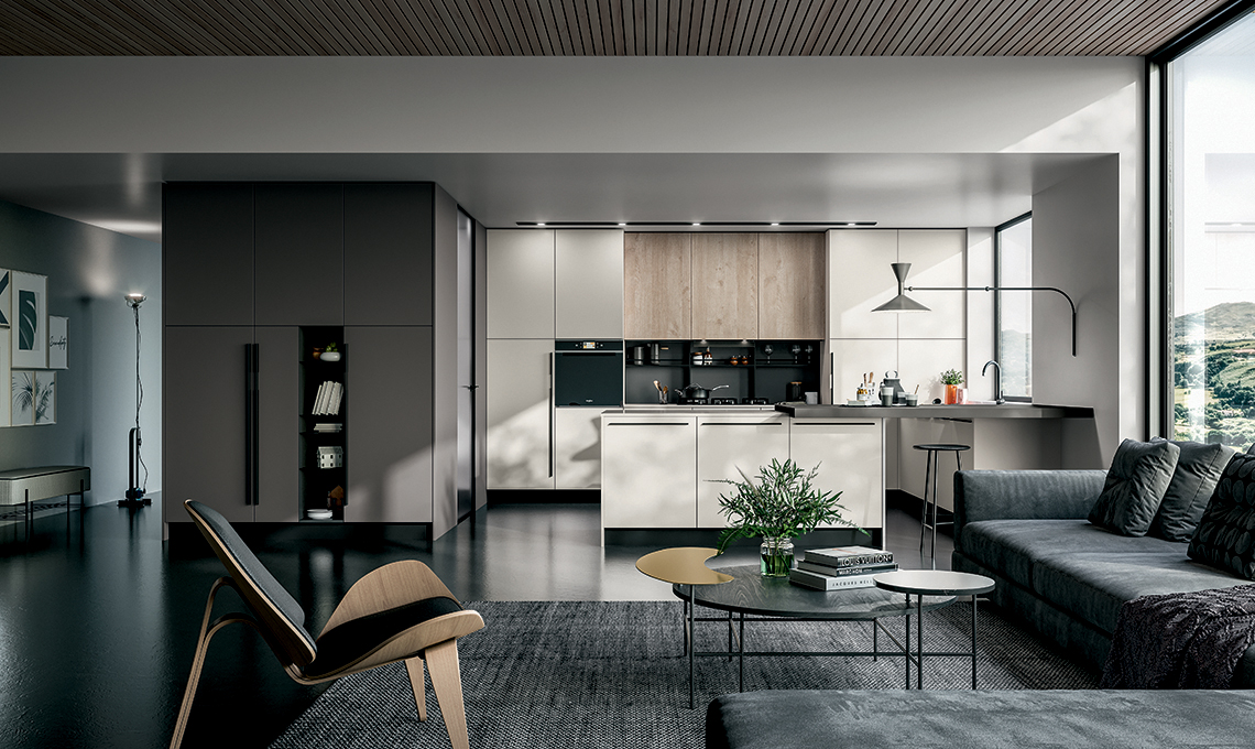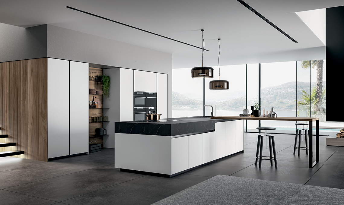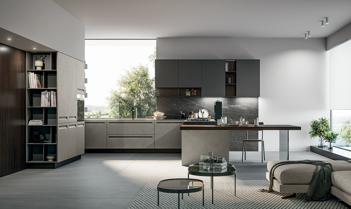 La composizione Round 03 ha le ante delle colonne a tutta altezza della zona living in PET lavagna matt più vano a giorno Air in metallo brunito; le ante delle colonne e delle basi della zona cottura - lavaggio sono in laminato seta bianco e i pensili in laminato poro registro roccia. La zona lavaggio con top in quarzo integra white M1 è collegata all’isola da un piano snack in Fenix grigio bromo. Dietro i fuochi, tra base e pensile c’è il sistema di raccordo con ripiani Open, in finitura alluminio brunito e schienale in PET lavagna matt.