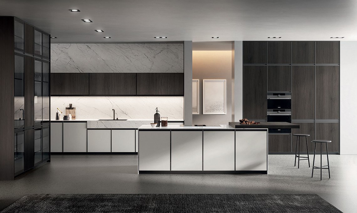 due isole distinte, unite tra loro dal piano snack a sbalzo in noce Italia di spessore superiore al top in Laminam pietra di Savoia grigia. Completano la composizione le colonne a parete dalle ante in vetro selenio opaco e vetro fumè che ospitano gli elettrodomestici accostate alle vetrinette con luci Led dal telaio titanio che supporta il vetro fumè. Le basi in Laminam pietra di Savoia grigia hanno maniglia integrata nel telaio e lo zoccolo finitura titanio.