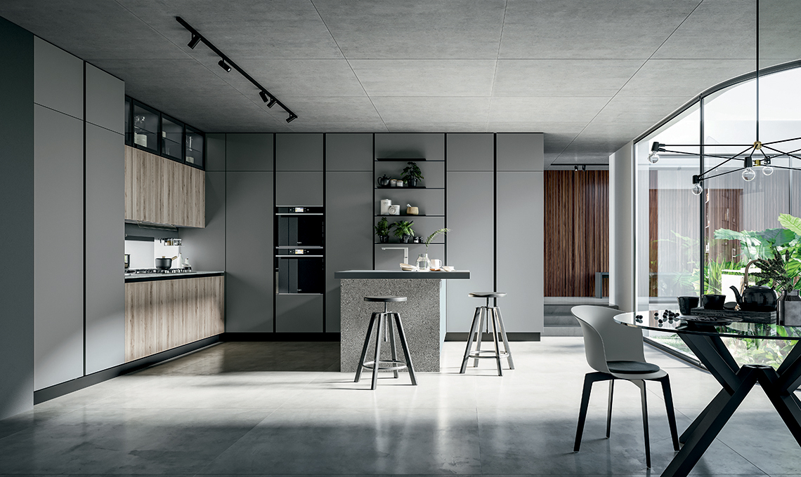 Il modello Round 04 prevede molto spazio per dispensa ed elettrodomestici ospitati in colonne a tutta altezza con ante in PET selenio matt (materia plastica senza PVC e priva di emissioni nell’ambiente). Le ante in laminato poro registro rovere grano di pensili, basi e piano snack, danno un senso di calore e sono superpratici. Il top e il fianco dell’isola sono in Infinity terrazzo grey compatto e impermeabile. La boiserie posta fra le colonne è attrezzata con ripiani in metallo brunito, mentre tra basi e pensili c’è lo schienale luminoso Bright con telaio in alluminio nero che consente di installare, nella parte superiore, accessori e utensili. Gola e zoccolo in finitura alluminio brunito.