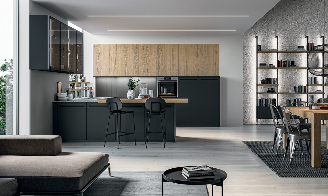 Il modello Tekna 04 ha le ante di basi e colonne in polimerico opaco nero matt su cui si staglia il calore del laminato rovere biondo di piano snack e pensili principali, a quali si aggiungono quelli con anta telaio in finitura alluminio brunito e vetro con illuminazione interna a Led posti sopra la penisola. Tra basi e pensili c’è la boiserie dogata in laccato opaco grigio cenere e il top delle zone operative è in Infinity Milan stone, materiale compatto e impermeabile fatto di minerali con cui creare anche le vasche del lavello integrate. Zoccolo in finitura alluminio brunito.