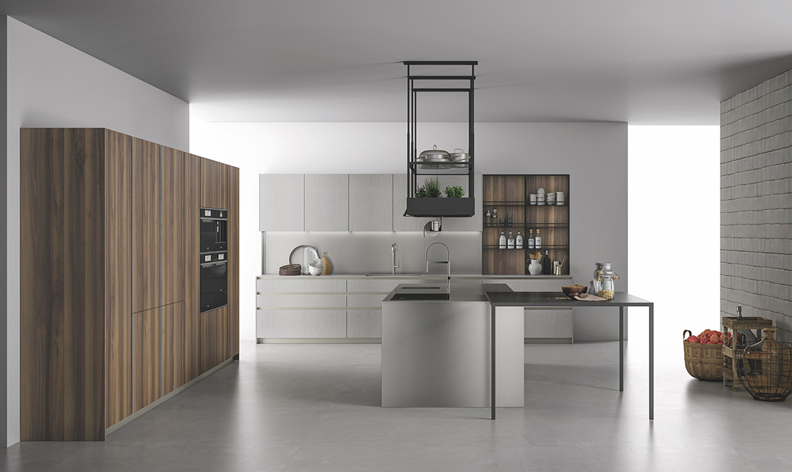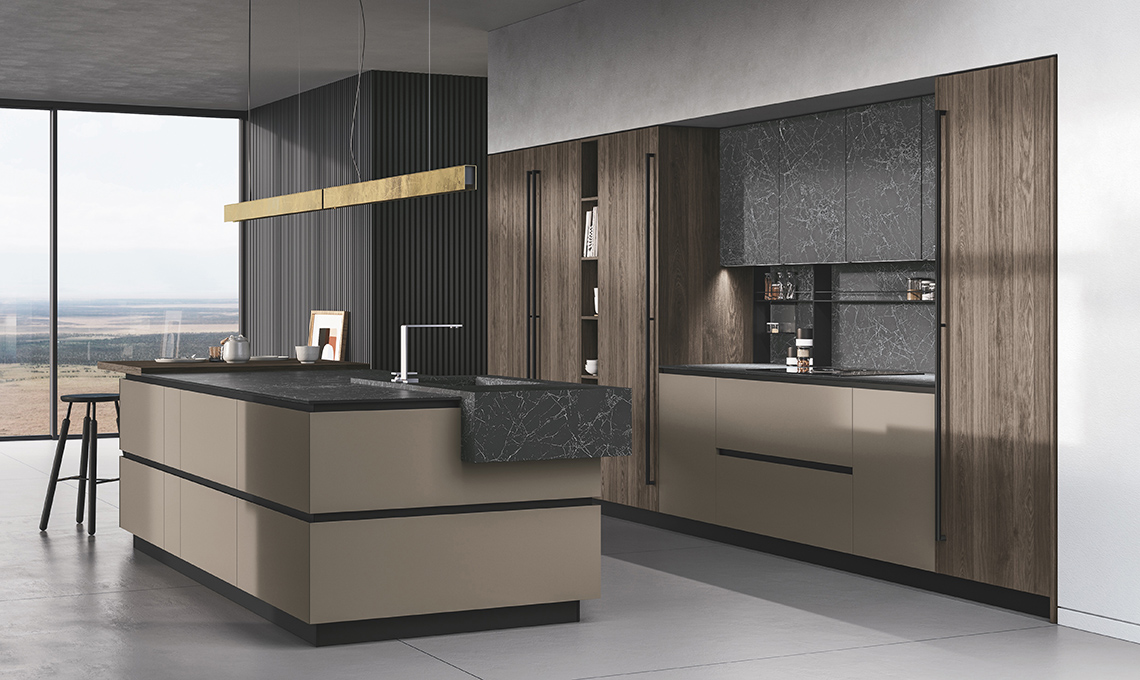 In questa versione, la cucina Aspen è caratterizzata sia dal calore del legno sia dal design dei sistemi di apertura a doppia gola intermedia che crea un interessante gioco di linee dal gradevole impatto estetico e rende ancora più funzionale la gestione di ante e cassetti. Le colonne sono in noce scalfito, basi e pensili in Fenix NTA® acciaio, telaio, gole e zoccoli in alluminio champagne ed elementi sopra top a giorno in metallo verniciato nero. Il top in Fenix NTA® acciaio, ideato per resistere ai segni del tempo e dell’utilizzo, si sposa idealmente e con grande eleganza con il metallo verniciato nero del piano snack. Con il Fenix NTA® Acciaio è rivestita anche la vasca del lavello realizzata in acciaio inox: l’integrazione è perfetta, senza fughe, per una pulizia impeccabile.