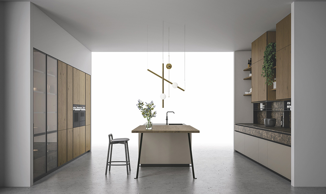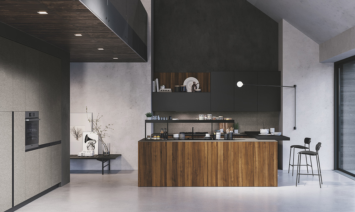 In questa versione lacucina D23 ha una struttura per blocchi funzionali articolata in blocco colonne, blocco parete con piano cottura e blocco isola con lavello. Lo snack di collegamento si può utilizzare sia come piano di lavoro sia come appoggio per cibi e bevande. In più, il gioco dei pensili a doppia altezza crea un particolare dinamismo nelle forme. Ante delle basi in essenza noce scalfito, delle colonne in Synchroface graniglia Basalto e dei pensili in Fenix NTM® Nero come il piano snack; top e schienale in Laminato HPL graniglia Basalto. La maniglia Rail in alluminio nero (ripreso nello zoccolo) che simula una gola crea un gioco di linee verticali e orizzontali dal grande impatto estetico. Gli elementi Modular in metallo nero permettono di riporre gli oggetti nelle fasi di preparazione. Le ante a terra con apertura push pull danno vita a un effetto monoblocco, riscaldato dall’effetto tattile del legno.