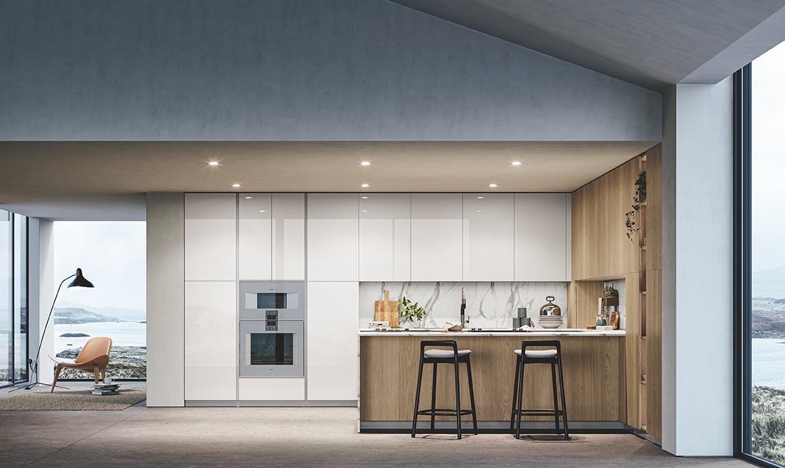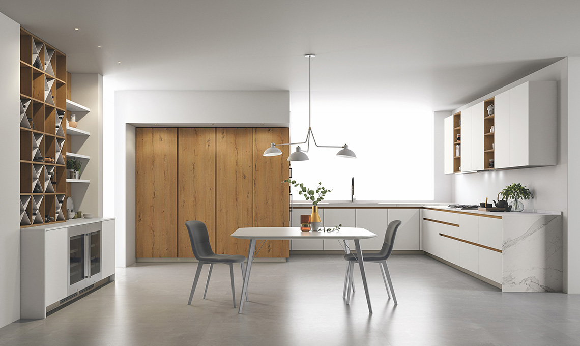 Una composizione Mix & Match per Aspen in bianco minimale abbinato a inserti dal sapore vissuto. Spicca la wine zone, elemento per estimatori: comprende due cantine refrigerate per vini, un piano di lavoro, mensole e vani portabottiglie. Le basi in vetro acidato laccato bianco sono rese particolari dalla doppia gola in rovere che segna l’alternanza degli elementi contenitivi sotto la zona cottura. Ulteriore dettaglio d’eccezione è il blocco delle colonne incassate, in rovere Nodato Antico, che tra i vari accessori nasconde un’area bucato con lavatrice e asciugatrice. I pensili in vetro acidaro laccato bianco si alternano ad elementi a giorno in rovere Nodato Antico; top in Silestone® Calacatta Gold pesare 6 e 2 cm, gole in rovere tinto antico e zoccolo da cm 8 in alluminio champagne.