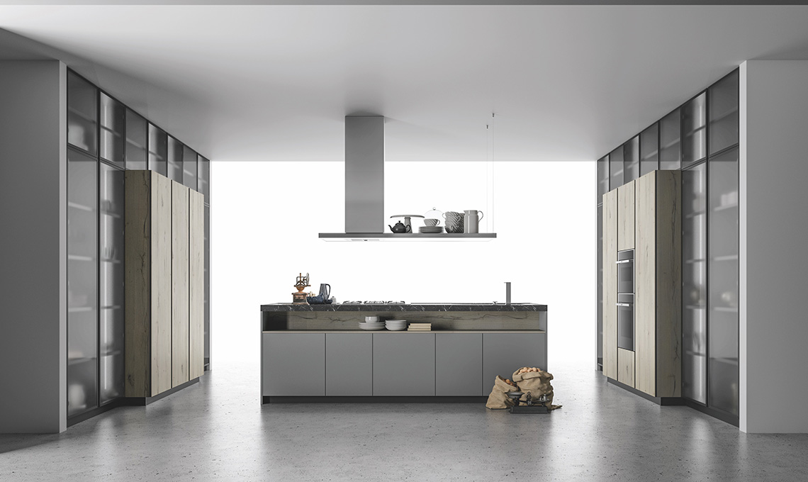Ordine e simmetria per questa versione della cucina Aspen: tutto ruota attorno all’isola centrale, sovrastata da una cappa in sospensione dalle linee essenziali. Nei portali laterali, il telaio nero incornicia con eleganza le ante in vetro acidato grigio, che bilanciano con leggerezza la struttura compatta delle colonne in rovere nodato cenere che ‘fuoriescono’ perché di spessore maggiore per accogliere gli elettrodomestici. Basi in Fenix NTM® grigio Antrim, top in marmo nero Marquina spessore 6 cm, gola e zoccolo da 8 cm in alluminio nero e vano a giorno in rovere nodato cenere.