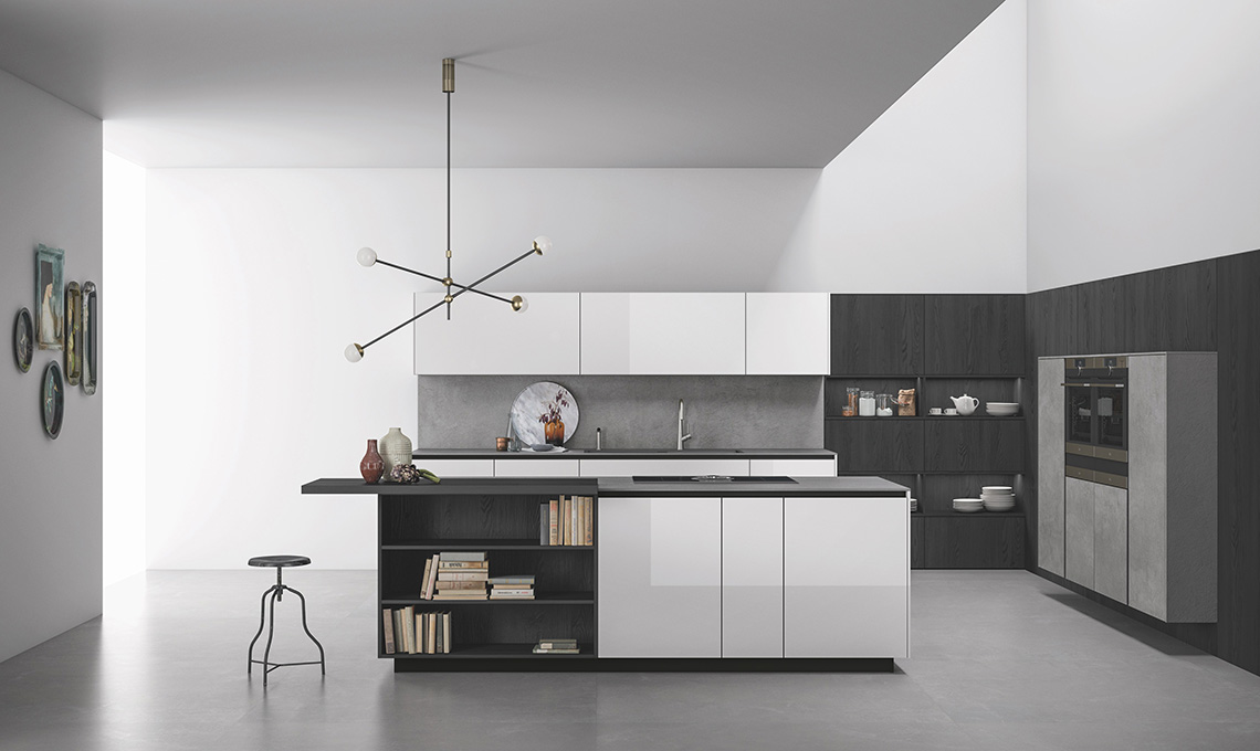 Versione black & white per questa composizione di Aspen disposta a elle attorno all’isola con l’ampio vano a giorno sotto il piano snack. Per far risaltare le mini-colonne in Grès Pietra di Savoia Grigia ‘a sbalzo’, resistente e tecnico, è utilizzato il castagno Nero, materiale preso in prestito dalla collezione SoHo sempre di Doimo Cucine. Basi e pensili in vetro lucido laccato bianco 9003, telaio Black, top in grès pietra di Savoia grigia bocciardata spessore 1,2 cm e piano snack in castagno nero spessore 6 cm; gola e zoccolo da 8 cm in alluminio nero.