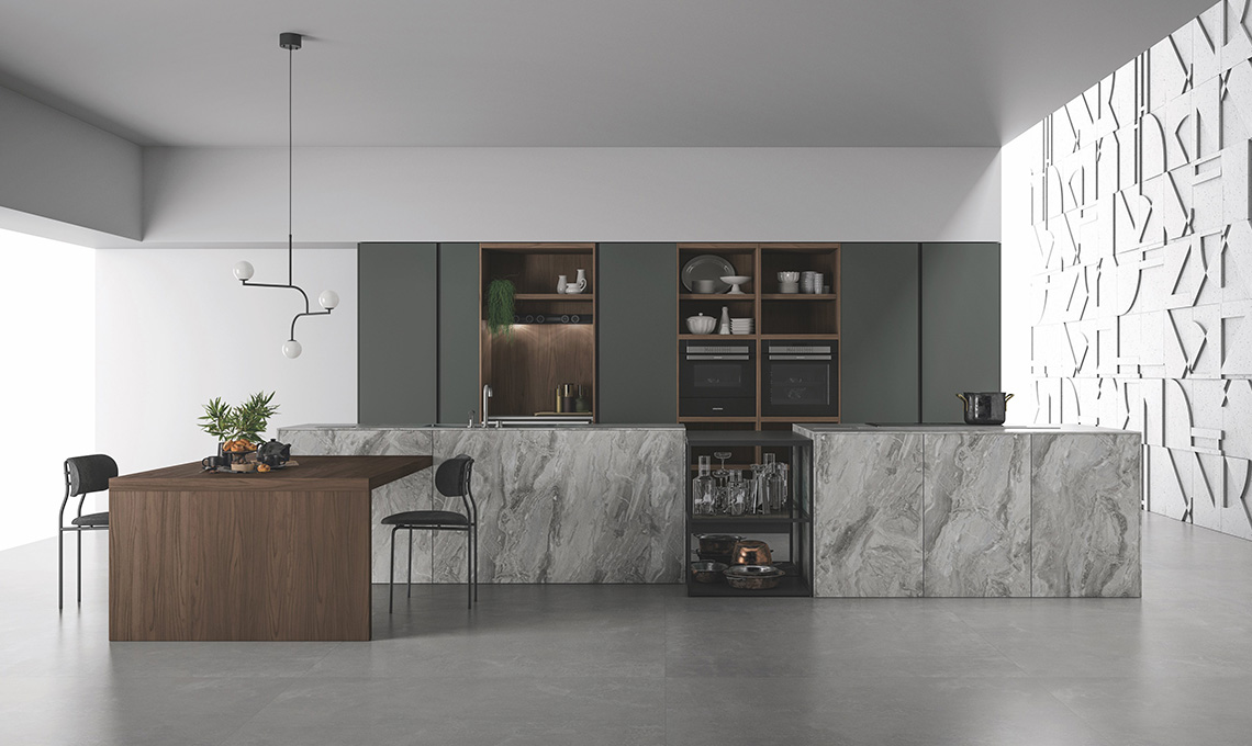 Di grande impatto la doppia isola in Stratificato HPL Pietra Palladio, con fianchi e ante che scendono in un unico volume. Le diverse profondità e il tavolo in melanico noce cannella spessore 6 cm ne alleggeriscono la struttura. Il particolare che stupisce? La cappa down draft: ospitata dentro il top, emerge per aspirare e illuminare solo quando serve, ideale per chi desidera scelte estetiche pulite. Colonne in Fenix NTM® verde Comodoro con inserti a giorno in melanico noce cannella; gole e zoccolo da cm 8 in alluminio nero.