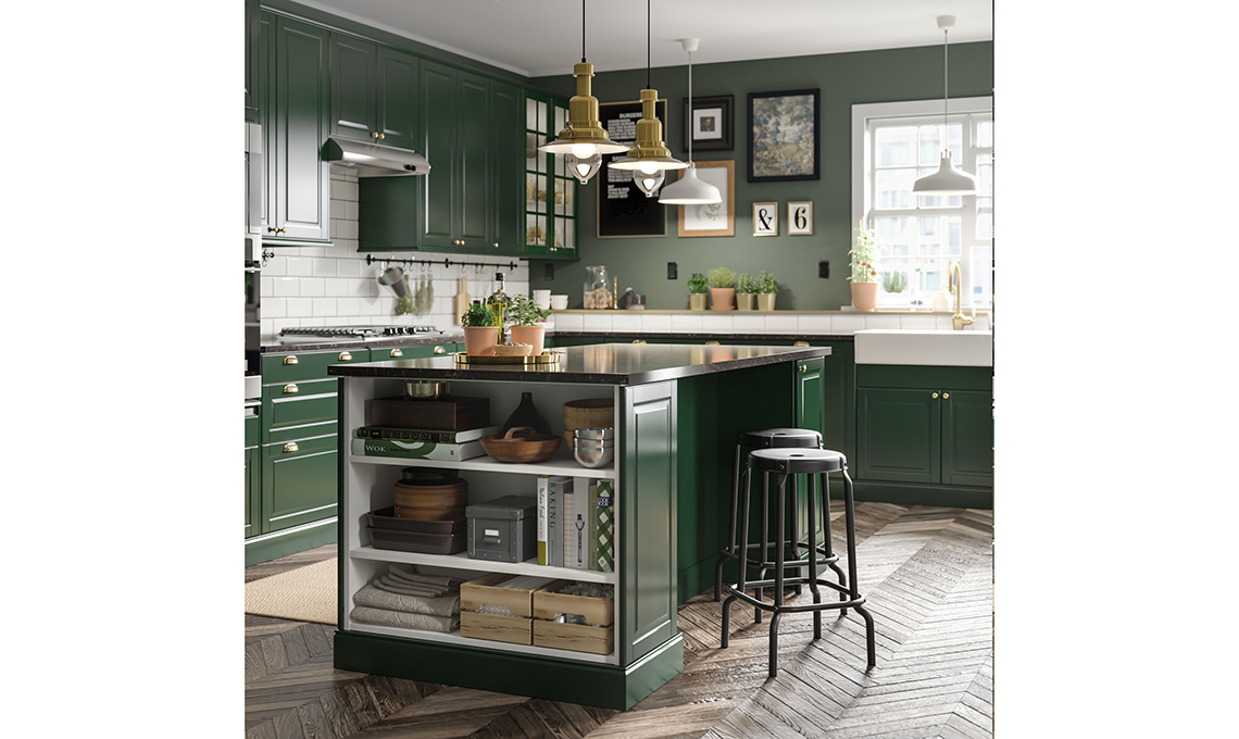 English Mood per la versione verde della cucina Metod con anta Bobdyn. Su un lato l'isola ha una composizione a credenza con ante a vetro in stile inglese.