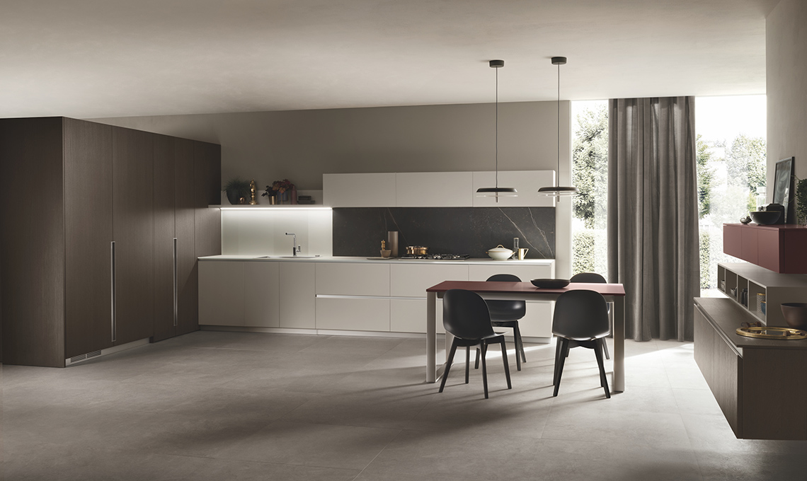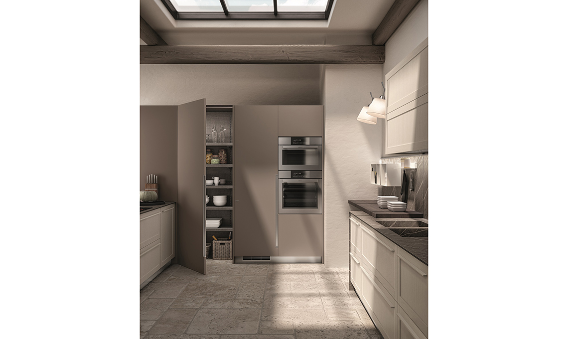 L'armadio-dispensa è uno spazio super versatile, grazie alle mensole da fissare all’altezza desiderata su una cremagliera; sono in finitura cassa (tessuto Antracite), le ante sono in finitura decorativo Grigio Selce. Il forno incassato a un’altezza da terra maggiore di 90 cm ne consente un uso ergonomico.