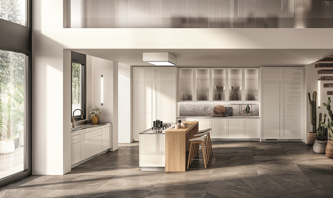 Questa composizione del modello LiberaMente, organizzato su due pareti ha le ante in vetro lucido Bianco Prestige per basi, pensili e colonne che ben contrastano con il laminato Pietra Grey di piani e schienali. A completare la composizione c’è la libreria appartente al sistema Parete “Fluida” in decorativo Bianco Puro. Gola e zoccolo sono in Bianco.
