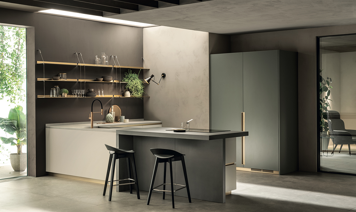 In questa composizione la cucina DeLinea Flat – design by Vuesse - con penisola, ha ante delle basi in laccato opaco Tortora e ante delle colonne in laccato opaco Verde Minerale. Linee armoniche e seducenti con basi da 80 cm di altezza e zoccolo da 7 cm. Piano cucina in Grès Calce Grigio - profilo spessore 3 cm - e banco colazione in Grès Calce Antracite, profilo spessore 6 cm. Semplicità formale e tecnica: le mensole realizzate in sottile lamiera di acciaio – finitura Ottone – sono abbinate a cavi che potenziano il bell’effetto estetico di tali elementi.