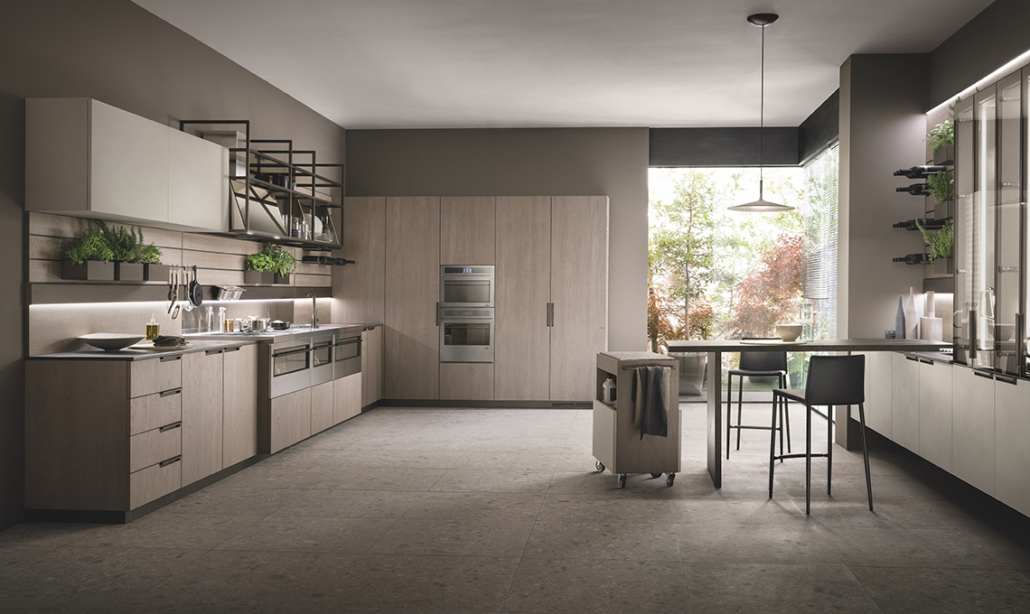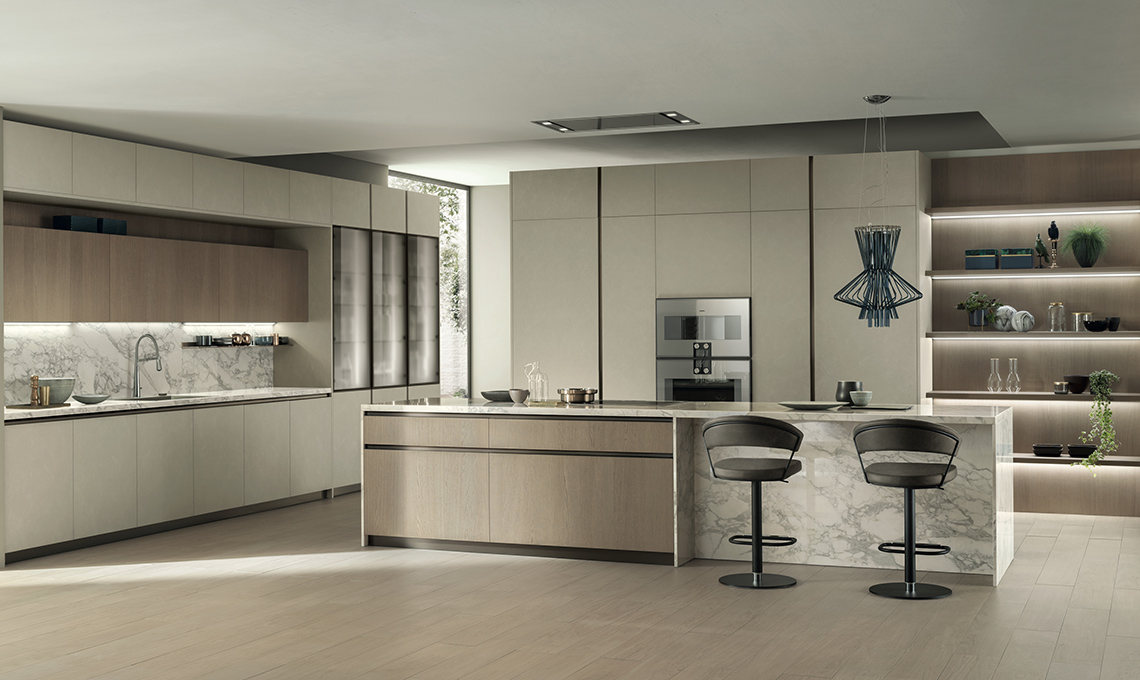 In questa versione la cucina DeLinea Round – design by Vuesse - con isola centrale, ha le ante in Biomalta Argilla Lima e impiallacciato Rovere Dune. Piano della cucina e piano dell’isola sono in Grès Arabescato, spessore 4 cm. Materiali di pregio che impreziosiscono una composizione importante con telaio in alluminio e vetro fumé utilizzato per le vetrine. L’apertura è realizzata dal profilo in alluminio incassato con taglio a 40° per facilitare la presa e in tinta con la gola incassata. Il colore Bronzo – di profili maniglia, gole, mensole e zoccoli – disegna un raffinato motivo in questa composizione.