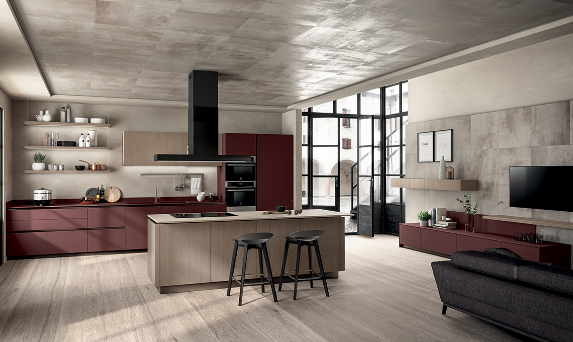 Composizione con isola centrale della collezione LiberaMente con ante in Fenix NTM® Rosso Jaipur e ante impiallacciate Rovere Dune. Il laminato Fenix NTM® Rosso Jaipur caratterizza il piano in spessore 12 mm, la zona lavaggio con vasche integrate e le ante della composizione a parete per creare uno stile essenziale, moderno e funzionale. Il piano dell'isola e della zona cottura è invece in Quarz Coral Clay - spessore 20 mm - in perfetta armonia con i colori di questo ambiente. Gola e zoccolo sono in finitura Bronzo. La zona living abbina le stesse finiture della cucina, il laminato Fenix NTM® Rosso Jaipur all’impiallacciato Rovere Dune con venatura verticale.