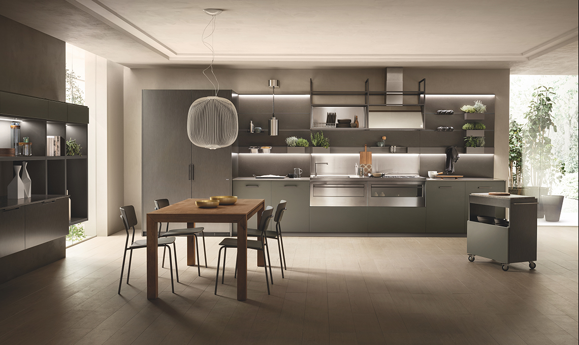 Composizione lineare della cucina MIA by Carlo Cracco con ante delle basi in laccato opaco Verde Minerale e maniglie a ponte in alluminio finitura Acciaio Scuro. Le ante delle colonne sono in laccato Acciaio Scuro con maniglie incassate verticalmente in metallo finitura Acciaio Scuro in linea con l’estetica degli elettrodomestici e incassate anche nelle basi della zona living. Piano cucina in quarz Calypso (spessore 2 cm) e piano in acciaio inox (spessore 5 cm) con zona cottura e lavabo integrato. A completare lo stile di MIA il progetto Line System: il sistema boiserie con accessori dedicati quali lampada riscaldante, porta bottiglie da parete, mensole, contenitori per erbe aromatiche e alimenti. Sopra, cappa, piattaia e ripiani di appoggio in vetro Stopsol chiaro. La struttura è in alluminio finitura Acciaio Scuro. Altra peculiarità è il carrello con vano a giorno con struttura laccato Acciaio Scuro con piano fisso.
