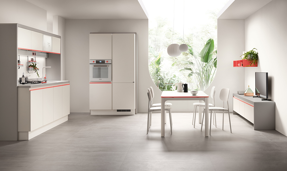 Dandy Plus di Scavolini, design Fabio Novembre è il nuovo progetto di cucina connessa caratterizzato da curve morbide, texture decorative e colori d’accento vivaci. L’elemento a ponte che incornicia definisce il profilo e rende il suo aspetto uniforme. Qui domina il Bianco Puro delle ante di basi e pensili, abbinato al Grey Plus del ponte e al Rosso Corallo, di maniglie, pulsanti, manopole e leva del miscelatore. Caratteristica distintiva del modello è la Task Bar, la barra attrezzata in alluminio posta sotto i pensili e fissata alla parete sulla quale si inserisce Alexa, il dispositivo altoparlante intelligente che controlla i vari impianti tecnologici attraverso BTicino Living Now. La Task Bar è arricchita anche da slot rotondi incorniciati da anelli in plastica riciclata sempre in Rosso Corallo che ospitano ad esempio prese elettriche e porte USB, ma anche mensole, accessori e contenitori, tutti in colori coordinati.